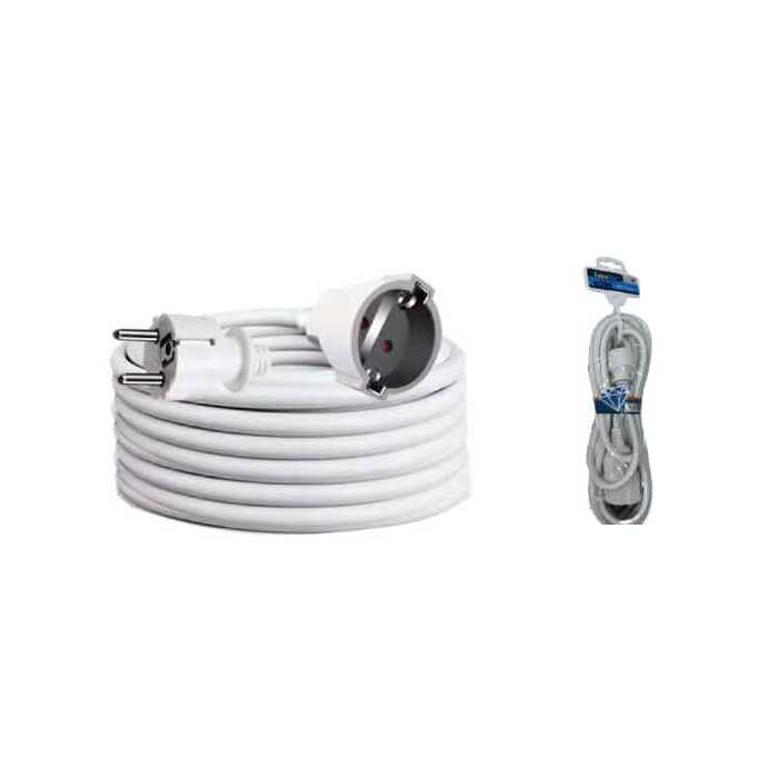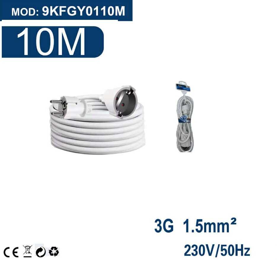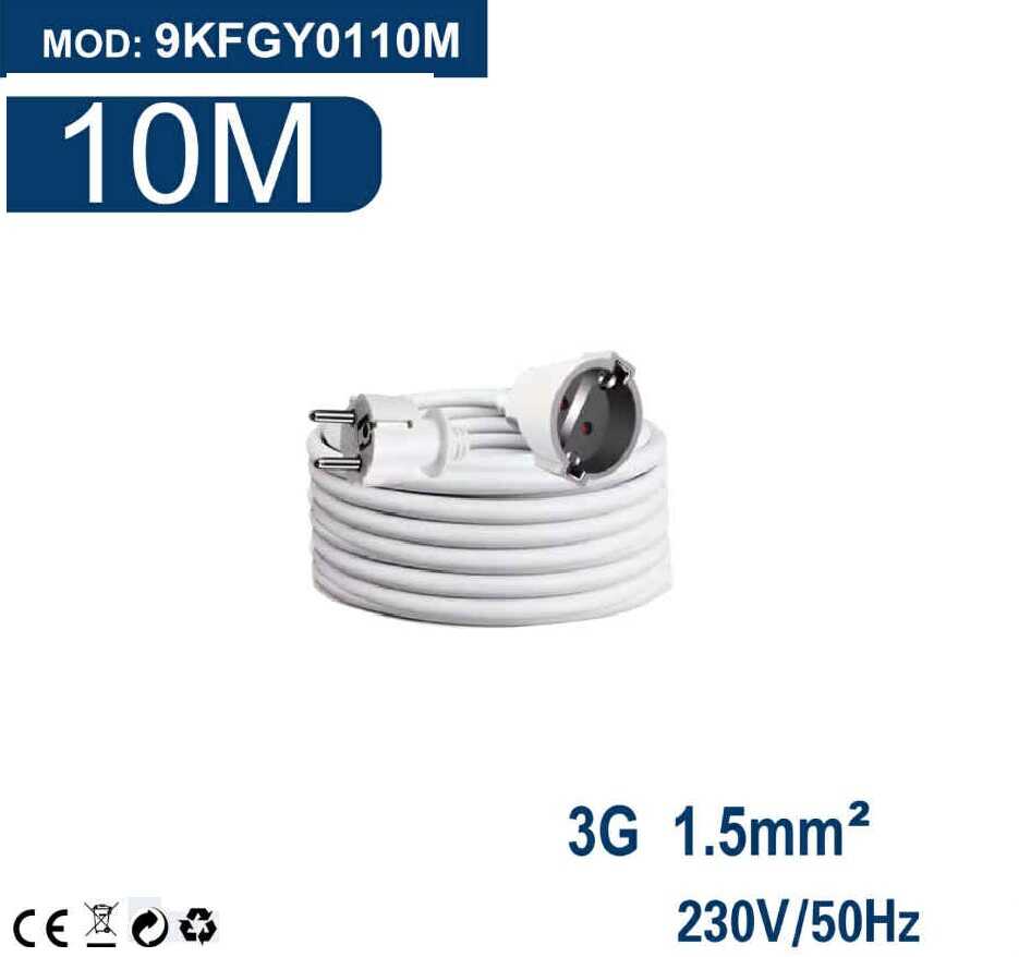 A termék 10 méter hosszú, fehér színű kábellel és egyenes kialakítású lengő aljzattal rendelkezik. A vezeték típusa 3G 1.5 mm2, amely biztosítja a hatékony áramvezetést és a nagy teherbírást. A csatlakozóaljzat földelt és beépített gyermekvédelemmel ellátott. A termék 230V/50Hz hálózati feszültségen való használatra hitelesített.