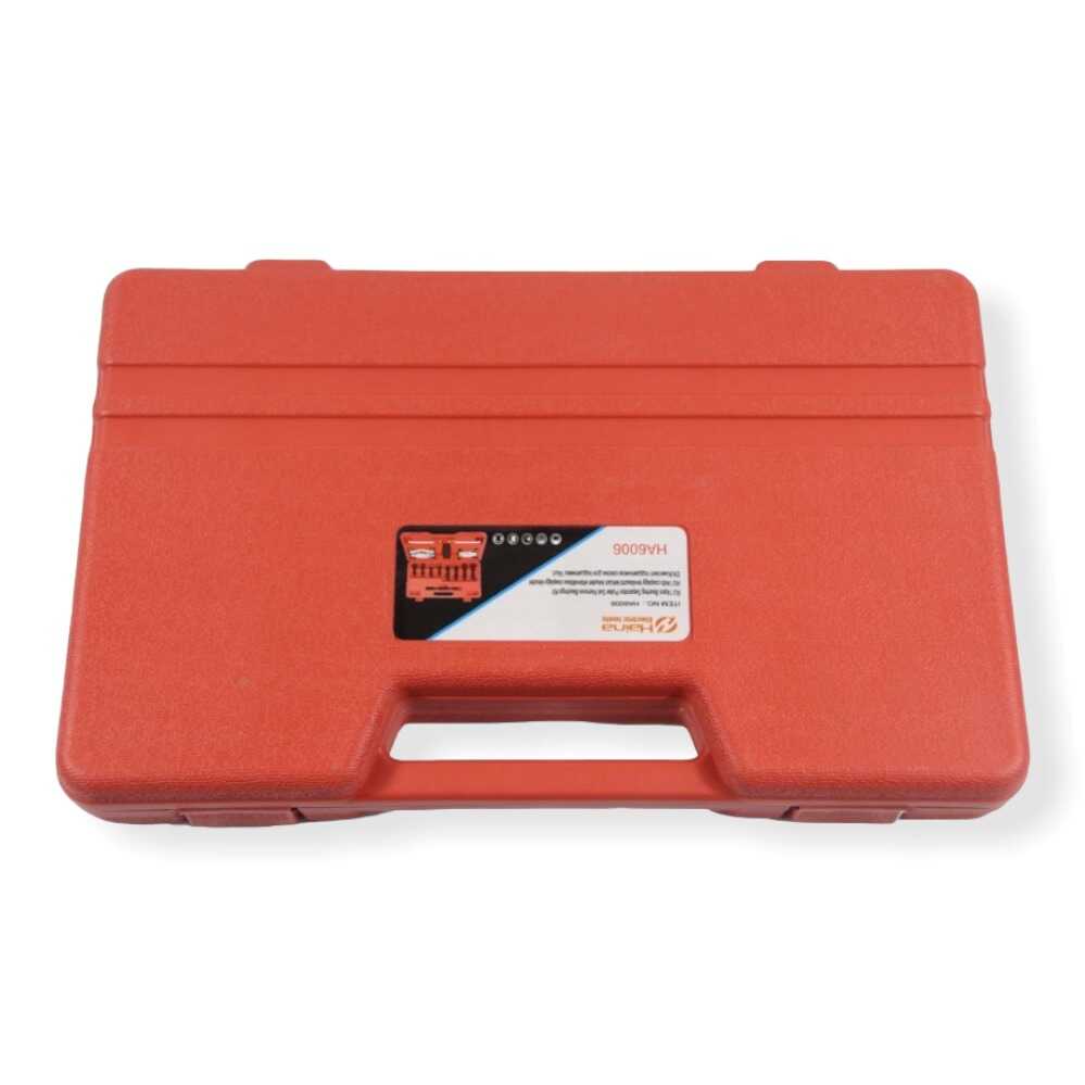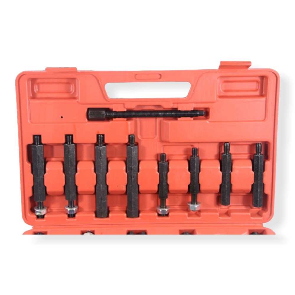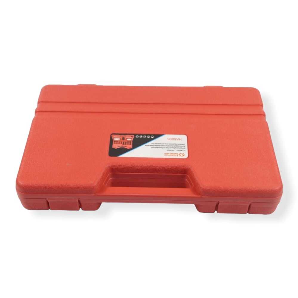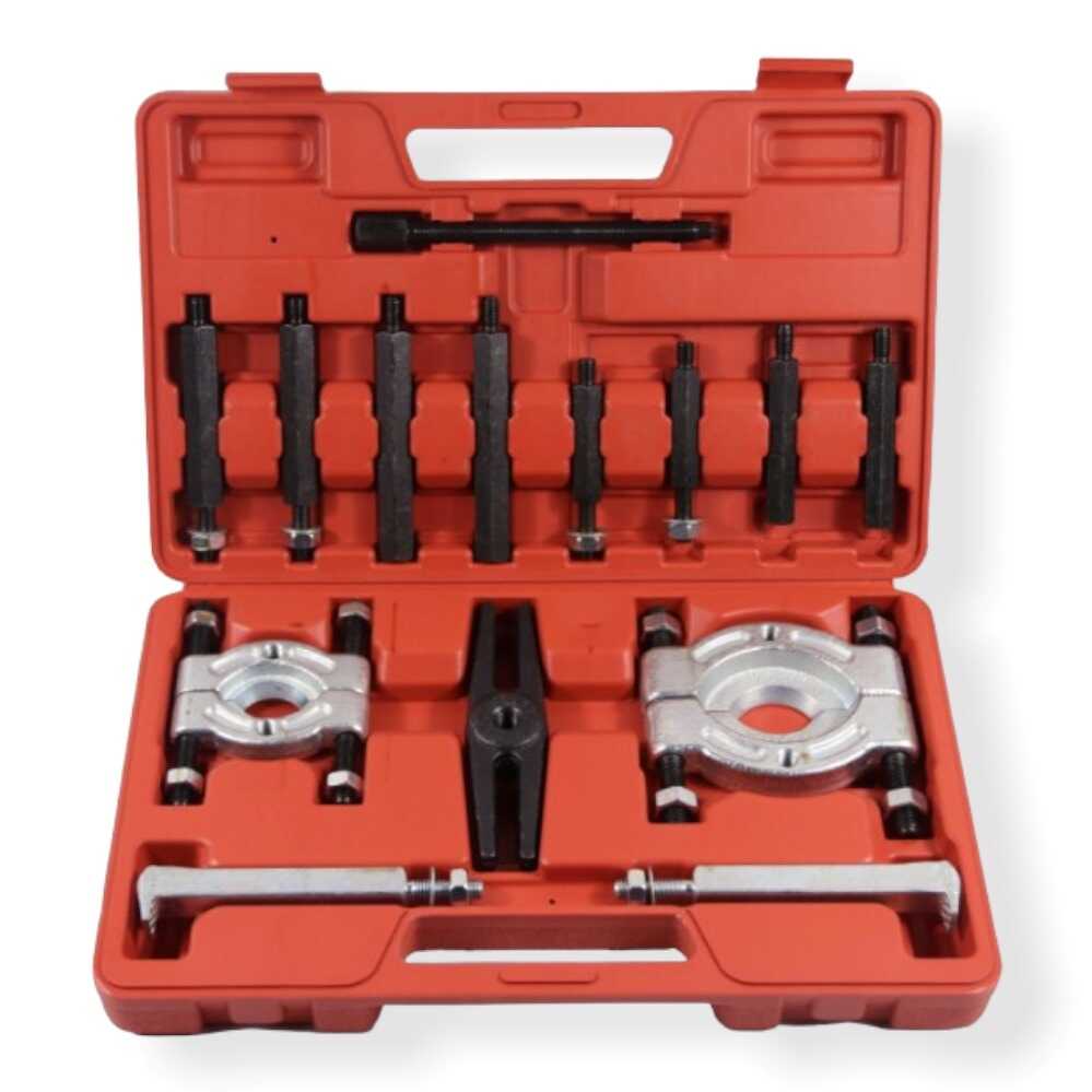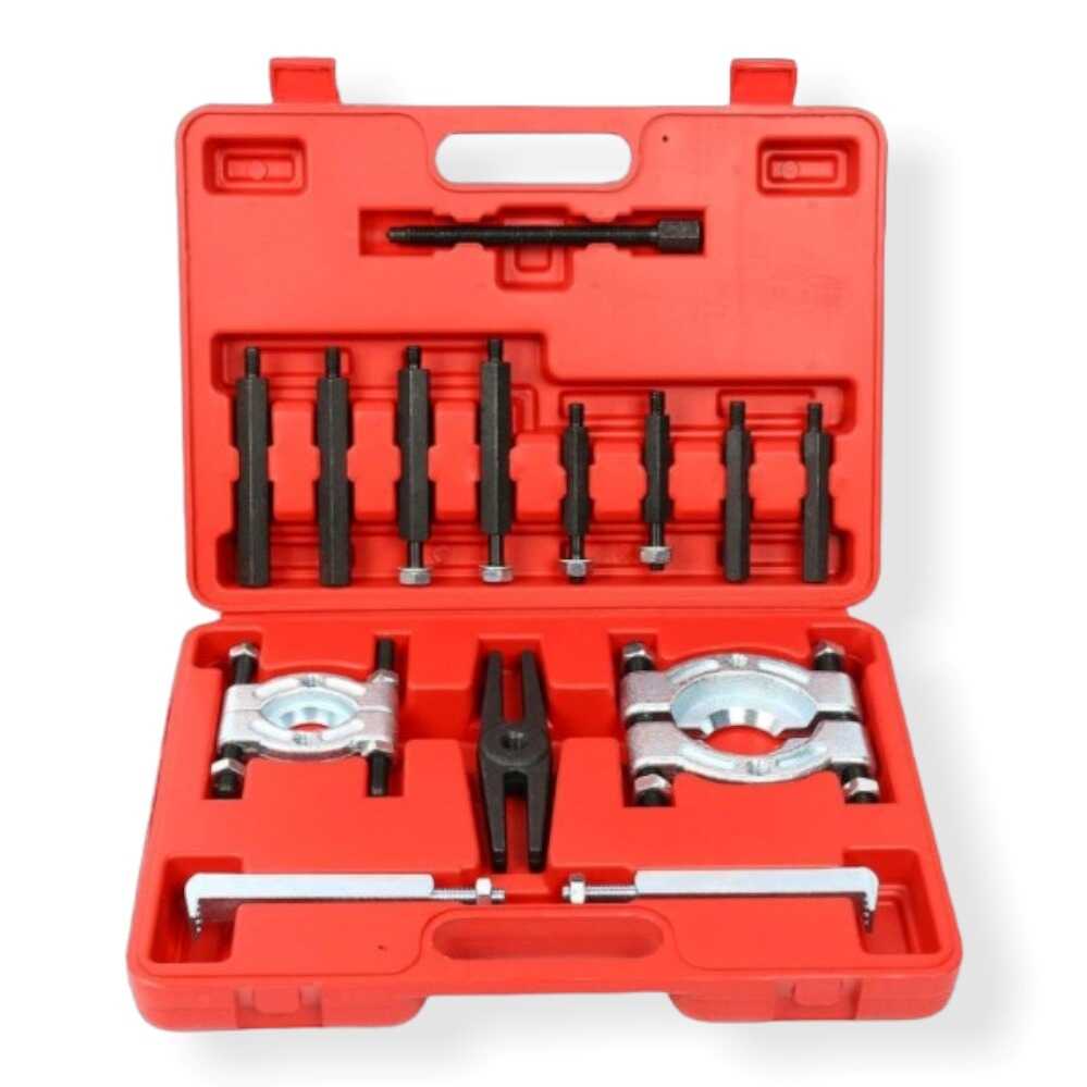 * 1 db 3″ csapágyelválasztó tányér, 1 db 2″ csapágyelválasztó tányér, 1 db húzóhíd (kereszttartó), 1 db központi nyomóorsó, 4 db fő toldószár, 4 db kiegészítő toldószár és egy masszív, piros rendszerező koffer.