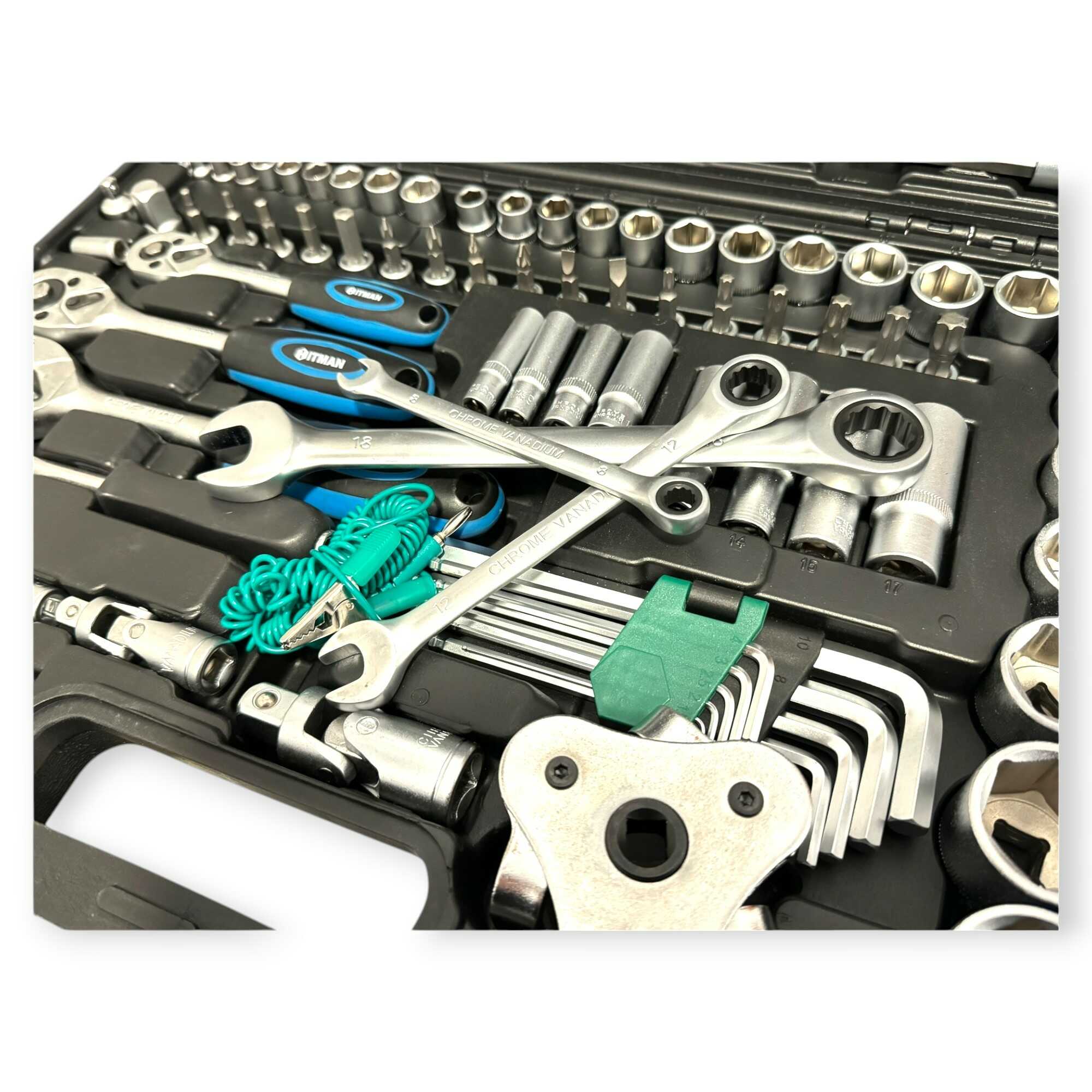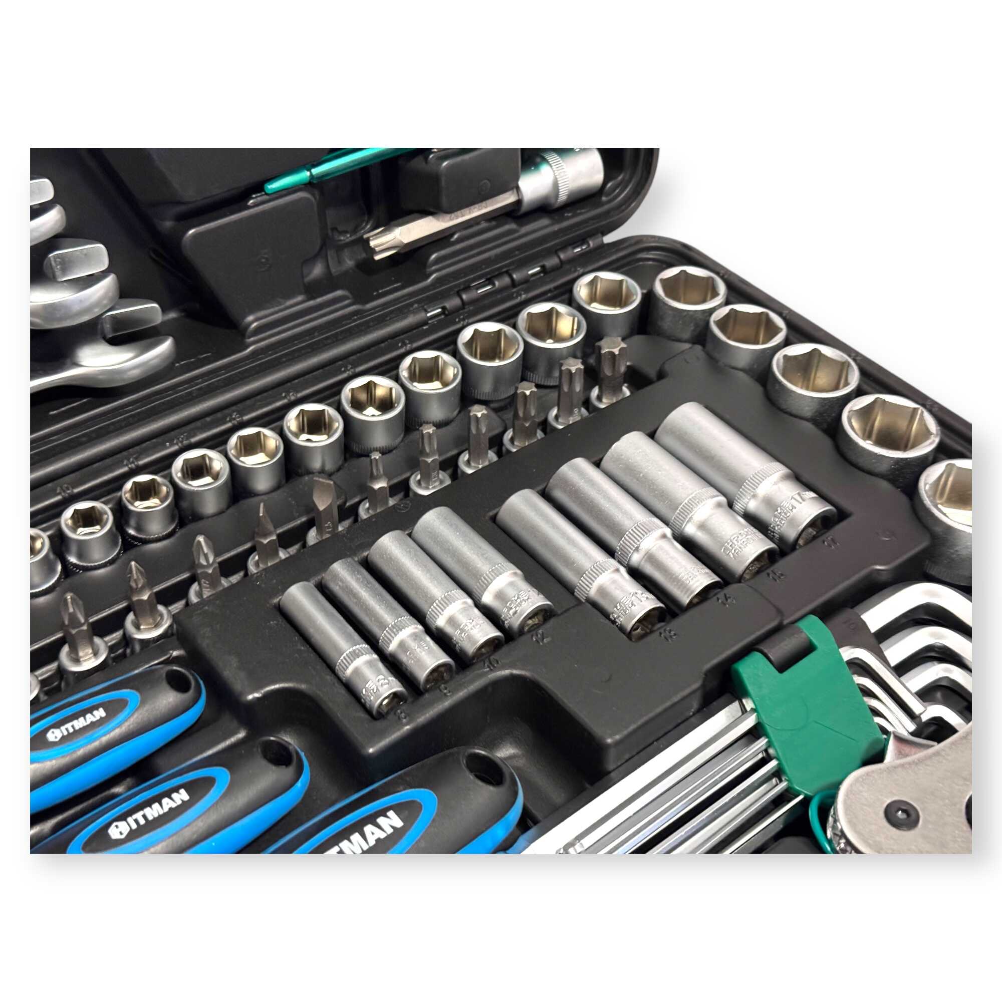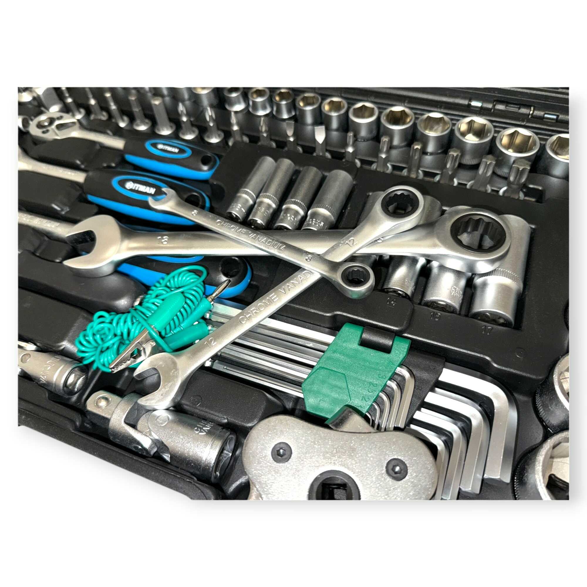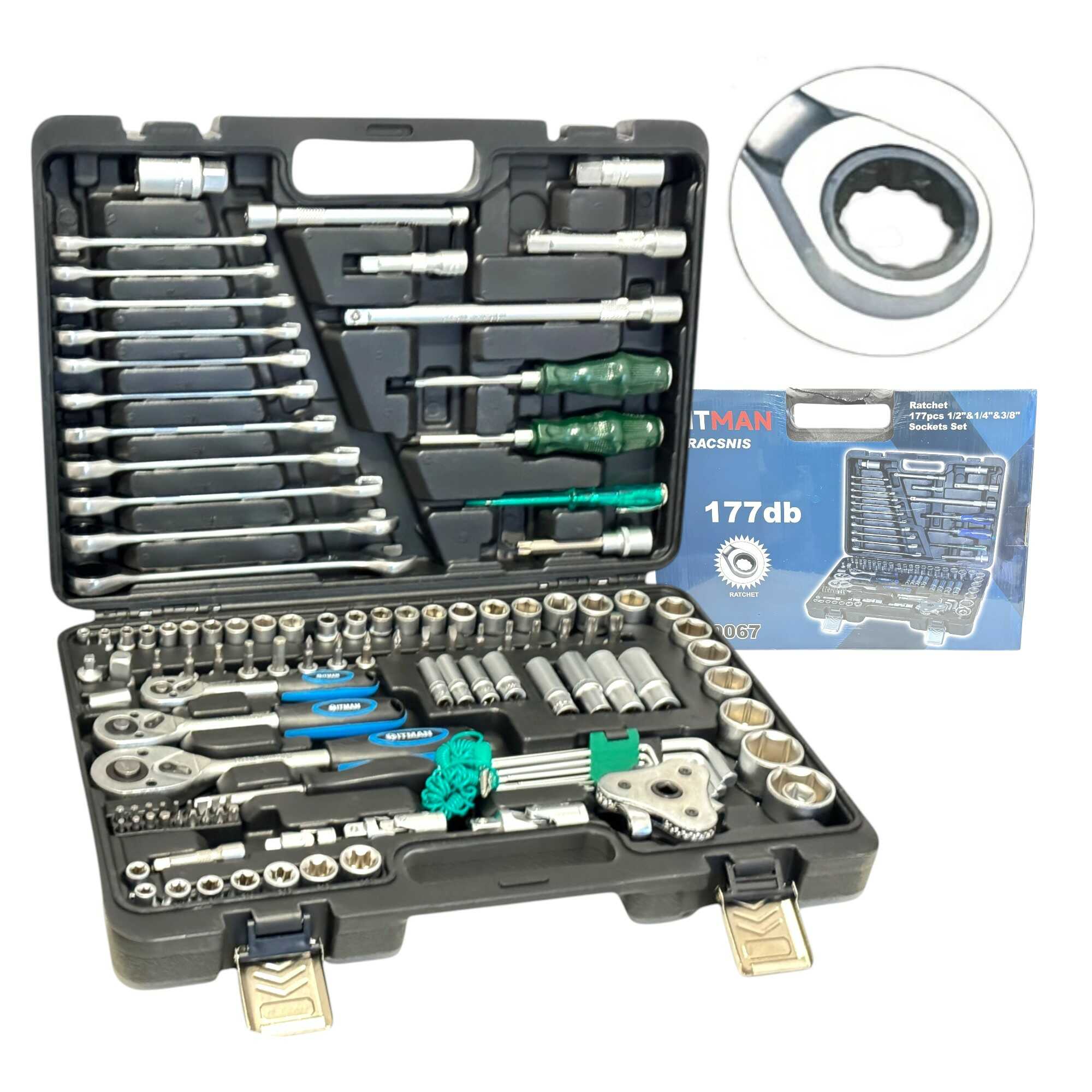 * 3 db professzionális racsnis hajtókar (1/4″, 3/8″, 1/2″), 11 db precíziós kombinált kulcs (8-19 mm), 56 db-os válogatott bitfej készlet (lapos, PH, PZ, Torx, Hex), rövid és extra hosszú dugókulcs fejek minden méretosztályban, univerzális csuklók, többméretű toldószárak és gyertyakulcsok.