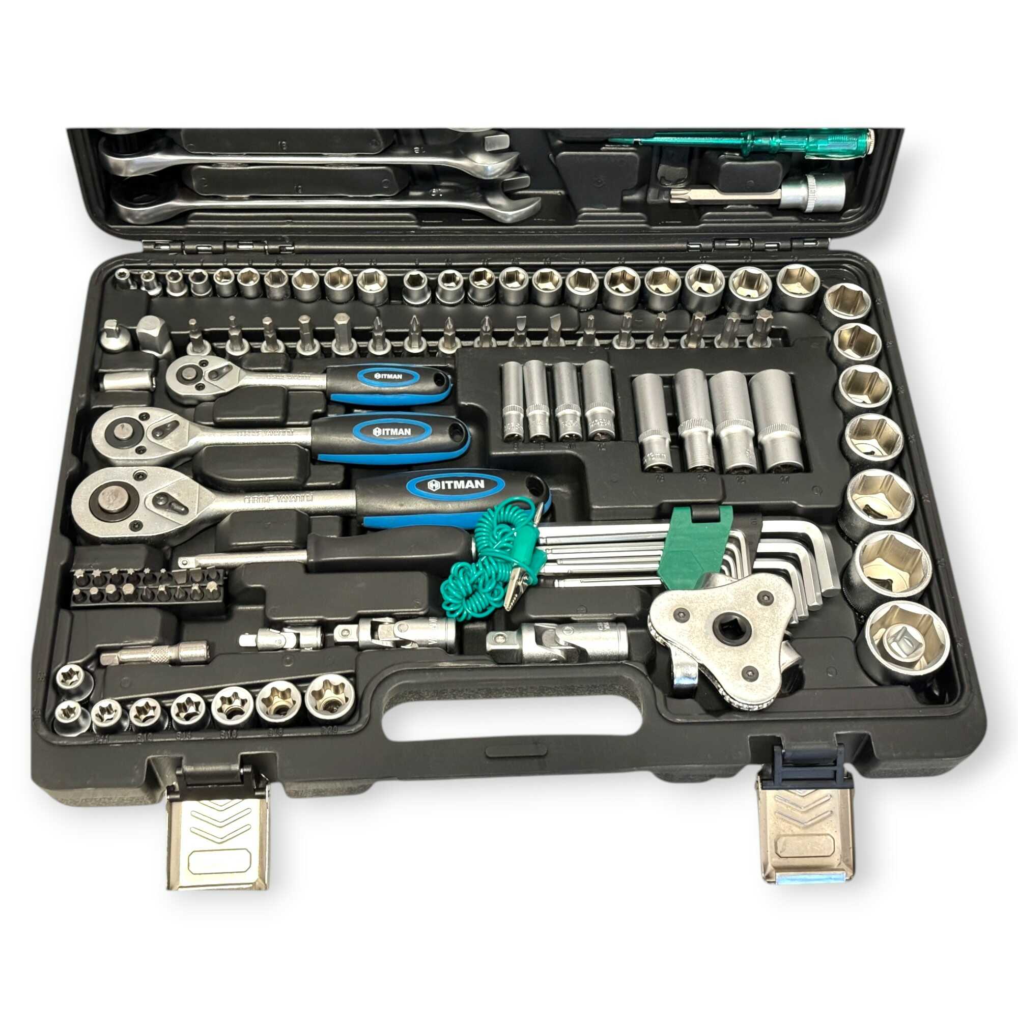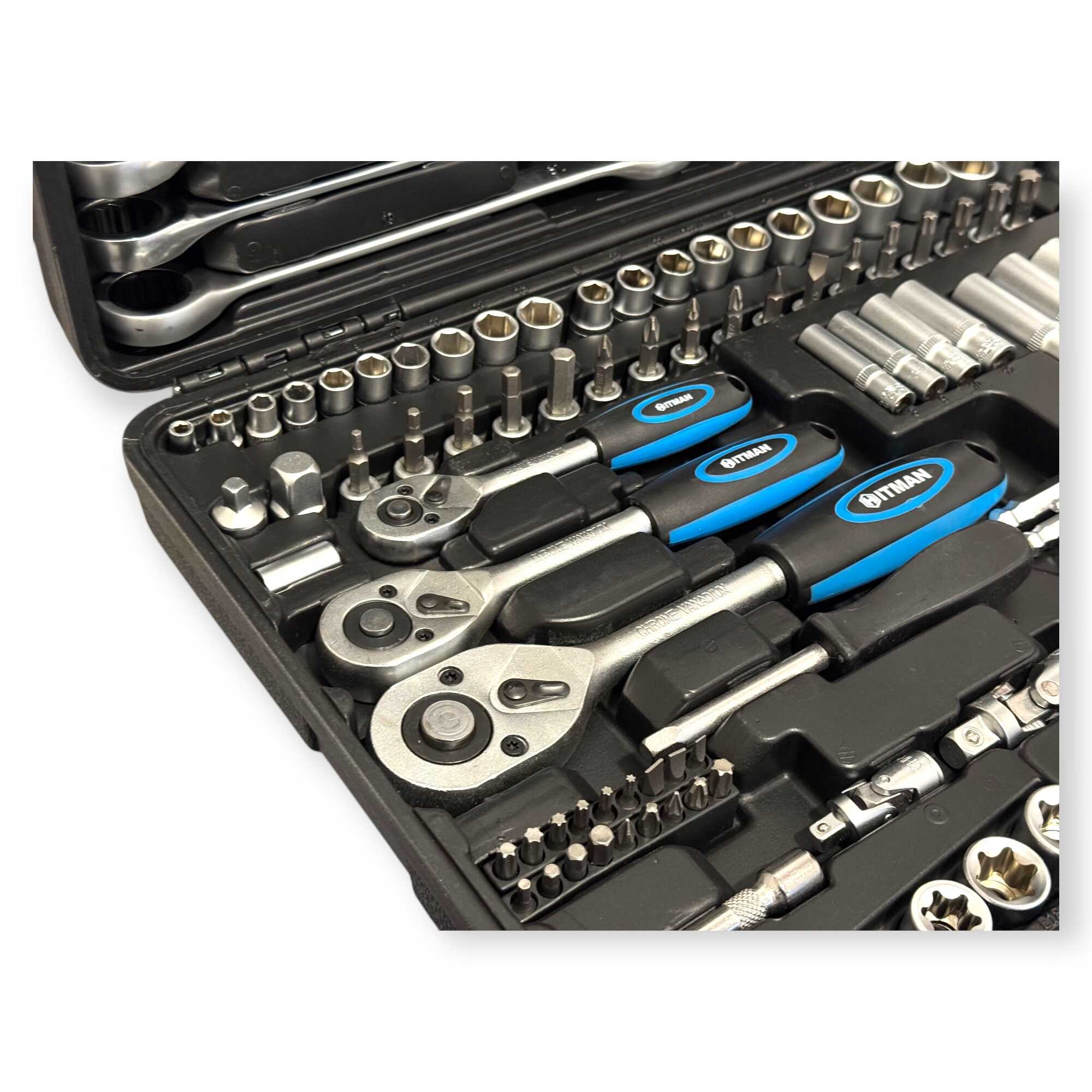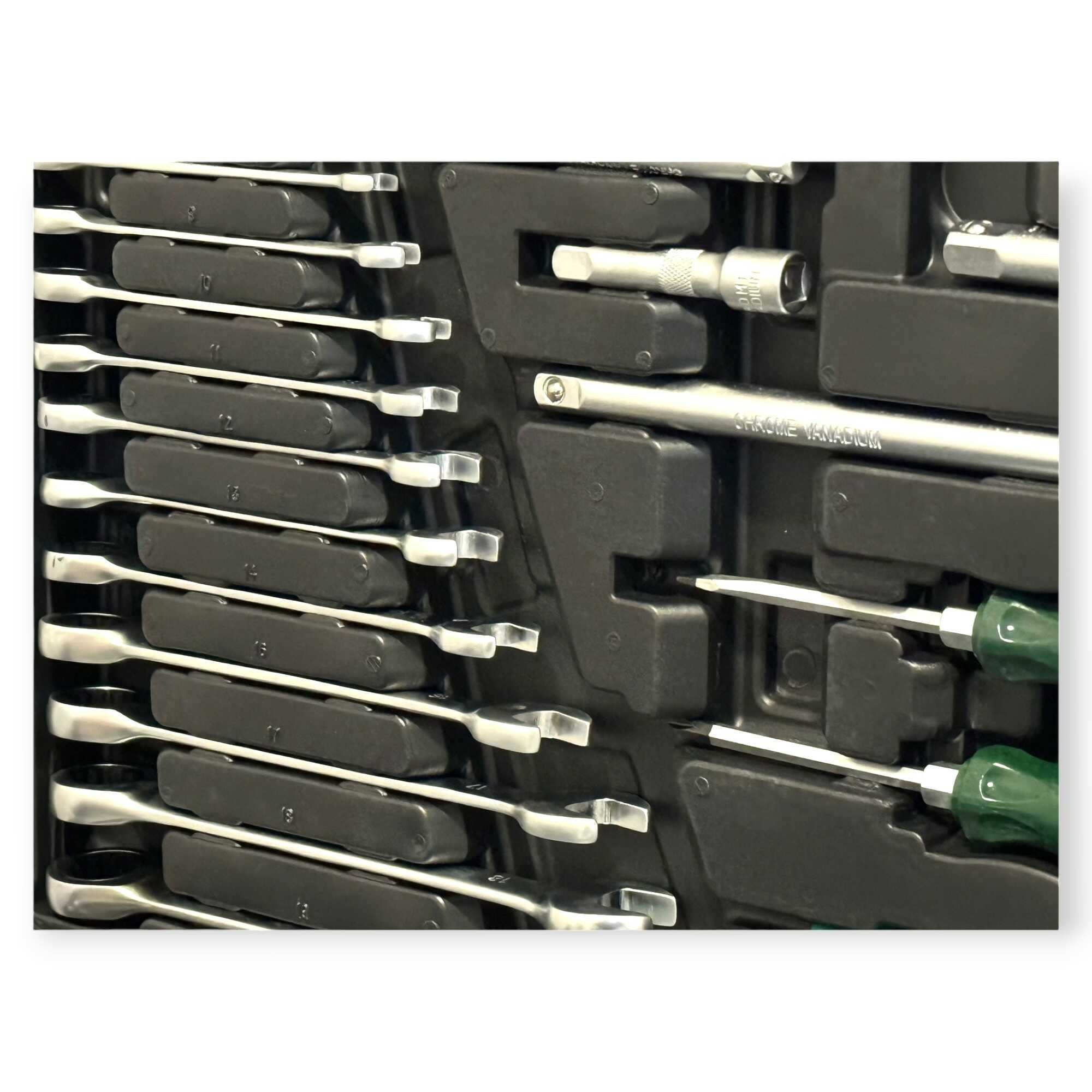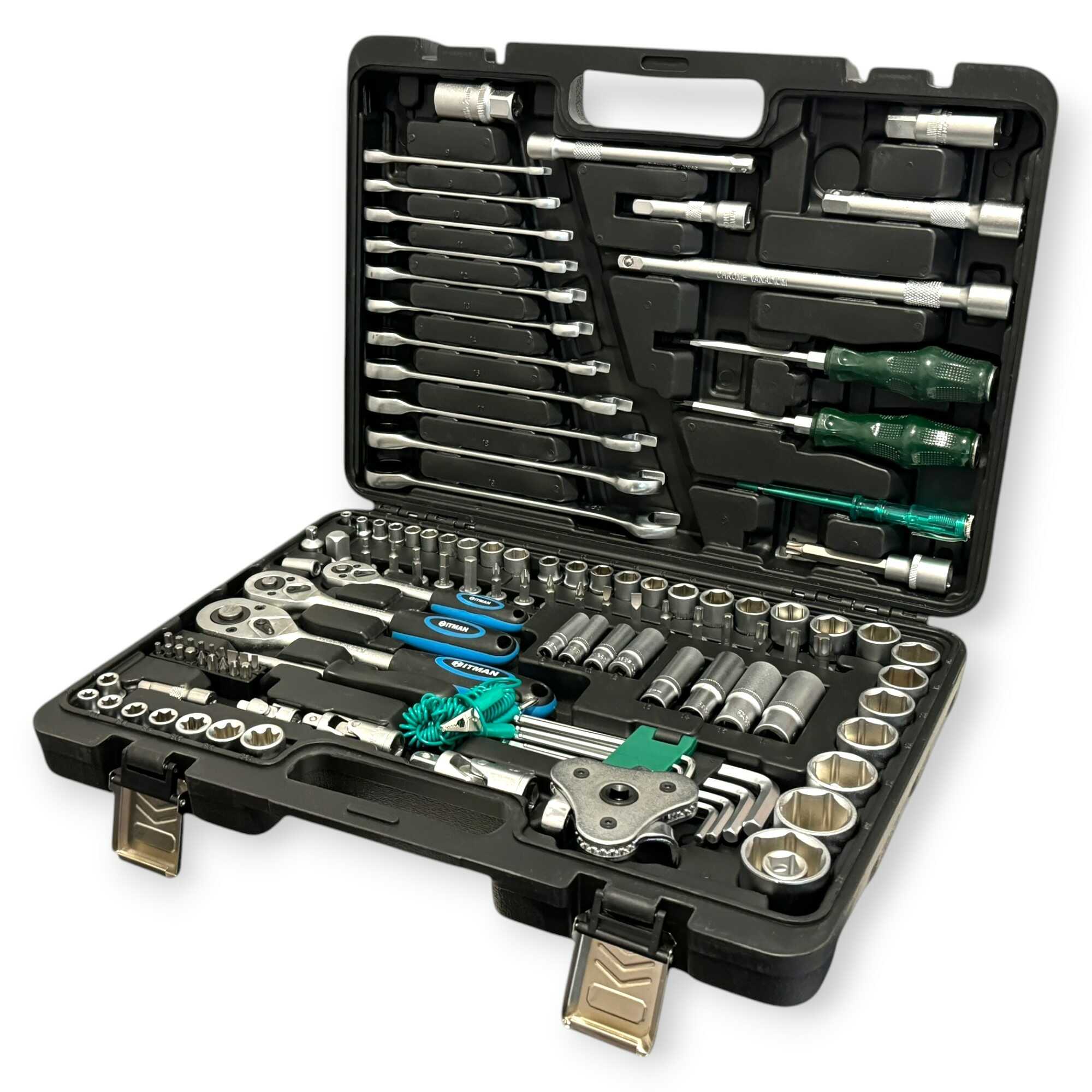 * 3 db professzionális racsnis hajtókar (1/4″, 3/8″, 1/2″), 11 db precíziós kombinált kulcs (8-19 mm), 56 db-os válogatott bitfej készlet (lapos, PH, PZ, Torx, Hex), rövid és extra hosszú dugókulcs fejek minden méretosztályban, univerzális csuklók, többméretű toldószárak és gyertyakulcsok.