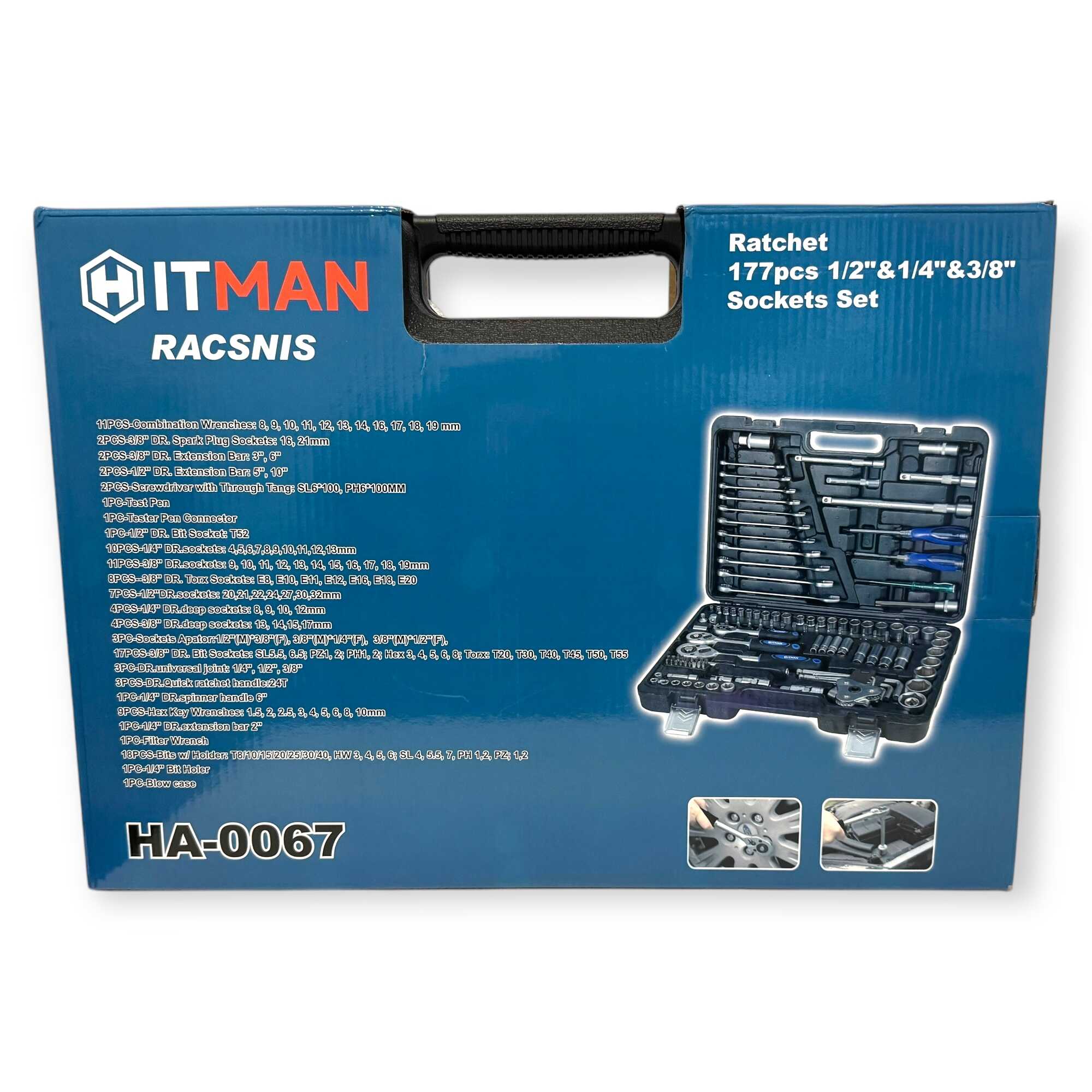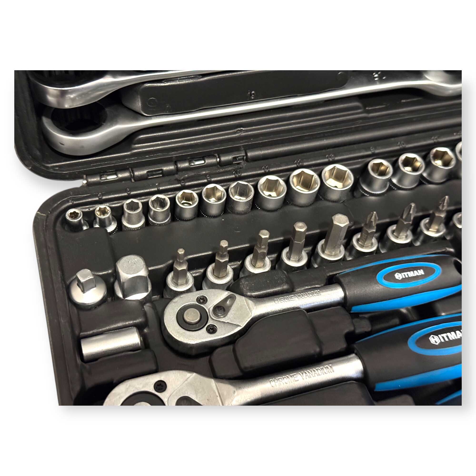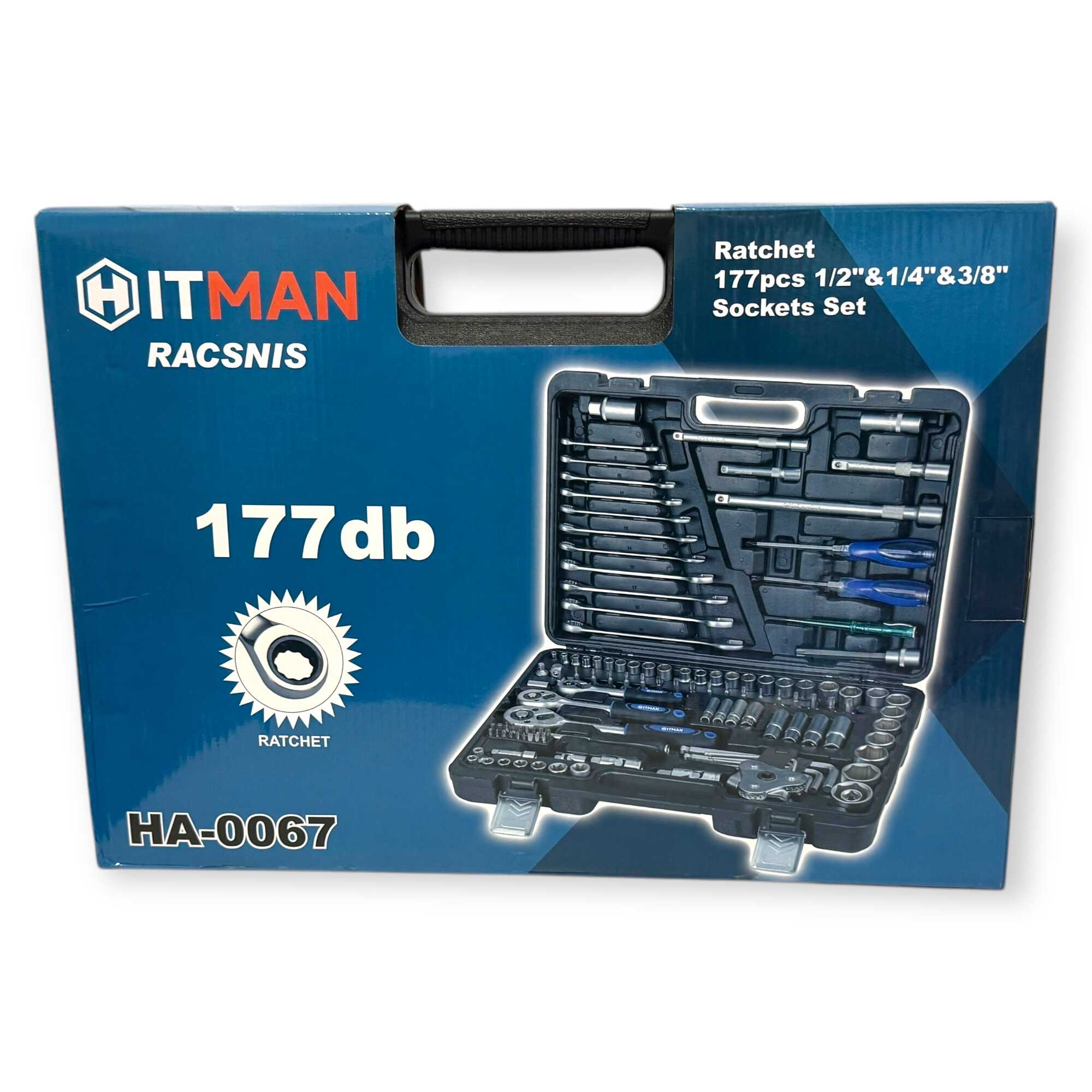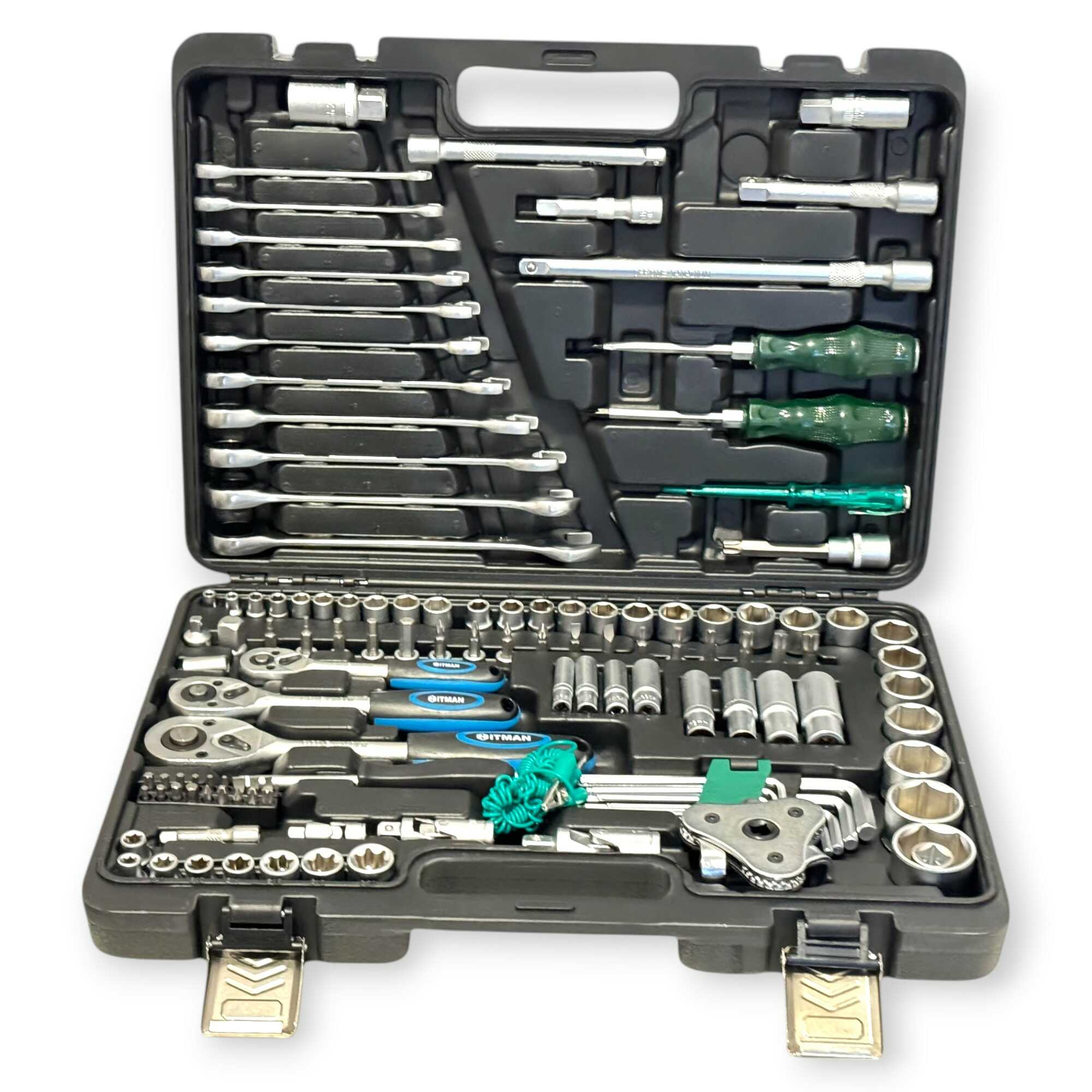 * 3 db professzionális racsnis hajtókar (1/4″, 3/8″, 1/2″), 11 db precíziós kombinált kulcs (8-19 mm), 56 db-os válogatott bitfej készlet (lapos, PH, PZ, Torx, Hex), rövid és extra hosszú dugókulcs fejek minden méretosztályban, univerzális csuklók, többméretű toldószárak és gyertyakulcsok.