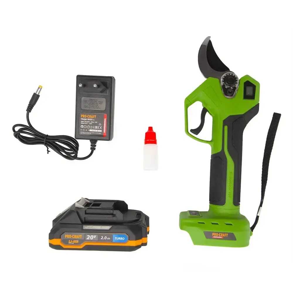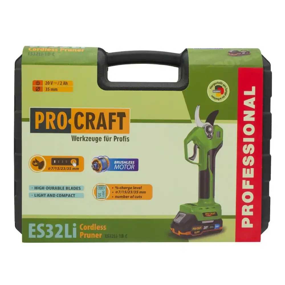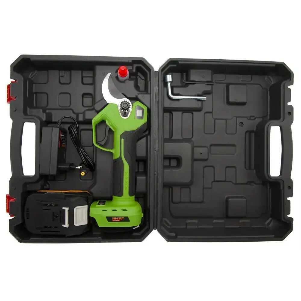 A készlet tartalmazza a PROCRAFT ES32Li akkumulátoros metszőollót, 1 db 20V 2Ah-s akkumulátort, a hálózati töltőt és egy strapabíró hordtáskát (kofert) a biztonságos tároláshoz.
