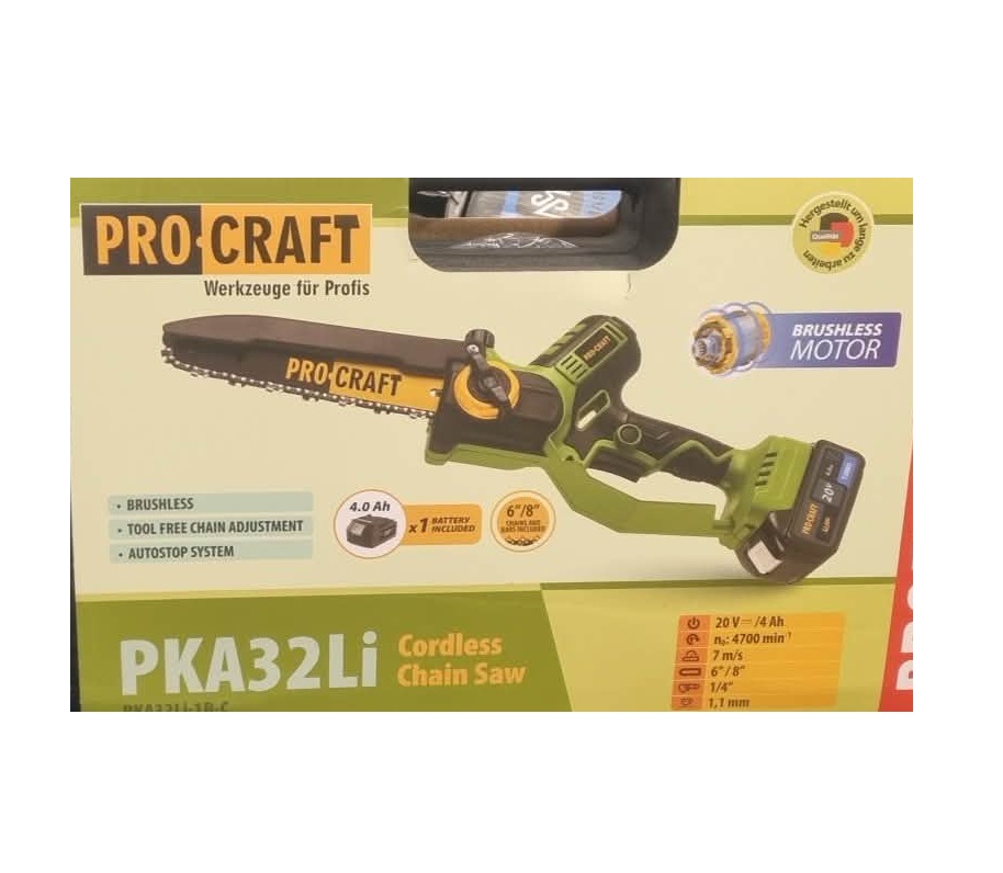 A készlet tartalmazza a PROCRAFT PKA32Li fűrészt, 1 db 20V 4Ah-s akkumulátort, a töltőt, két vezetőlemezt (152 és 203 mm), két fűrészláncot (152 és 203 mm), védőburkolatot és a használati útmutatót.