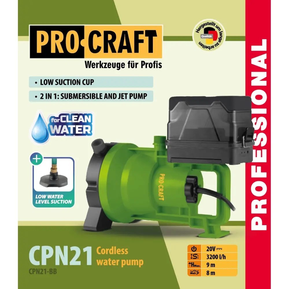 A készlet tartalmazza a PROCRAFT CPN21 szivattyúgépet, 1 db szűrőt, 1 db 2,1 m hosszú tömlőt, 2 db gyorskioldós csatlakozót, egy 10 méteres rögzítőkötelet és a használati útmutatót. FIGYELEM: Ez a verzió akkumulátor és töltő NÉLKÜL érkezik!