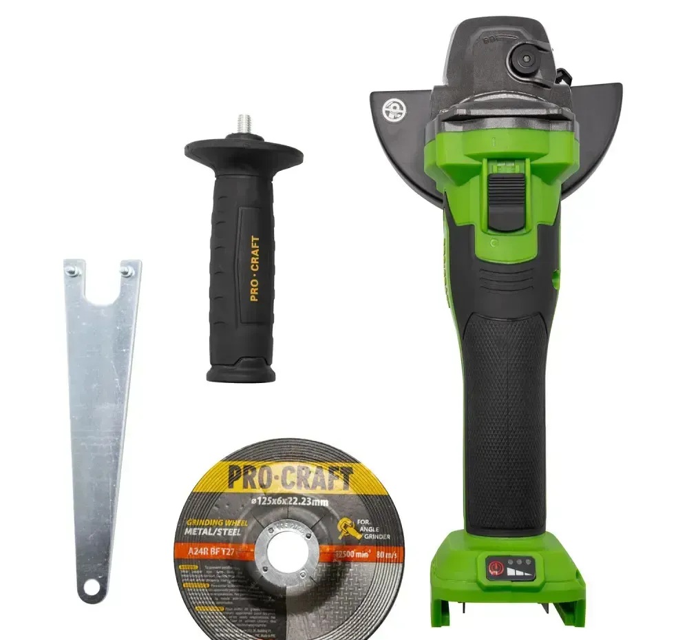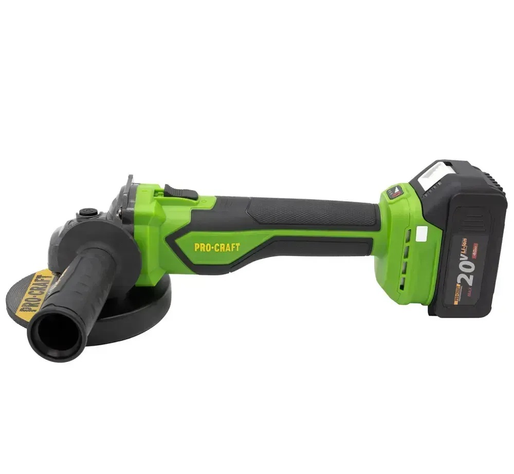 A szett tartalmazza a PROCRAFT PGA22 sarokcsiszolót, 1 db 20V 4Ah-s akkumulátort, a hálózati töltőt, a védőburkolatot, a markolatot, a kulcsot és a kényelmes hordtáskát.