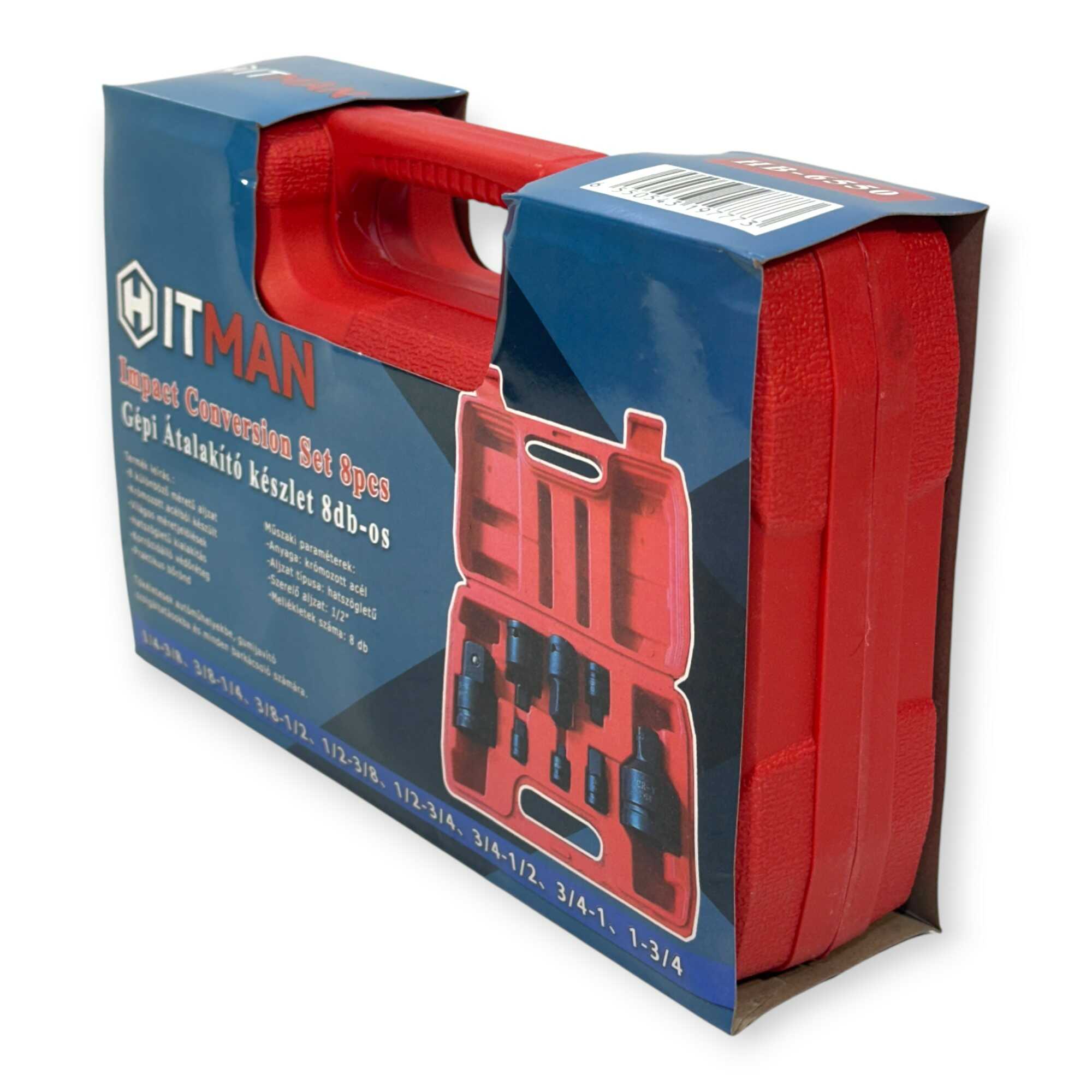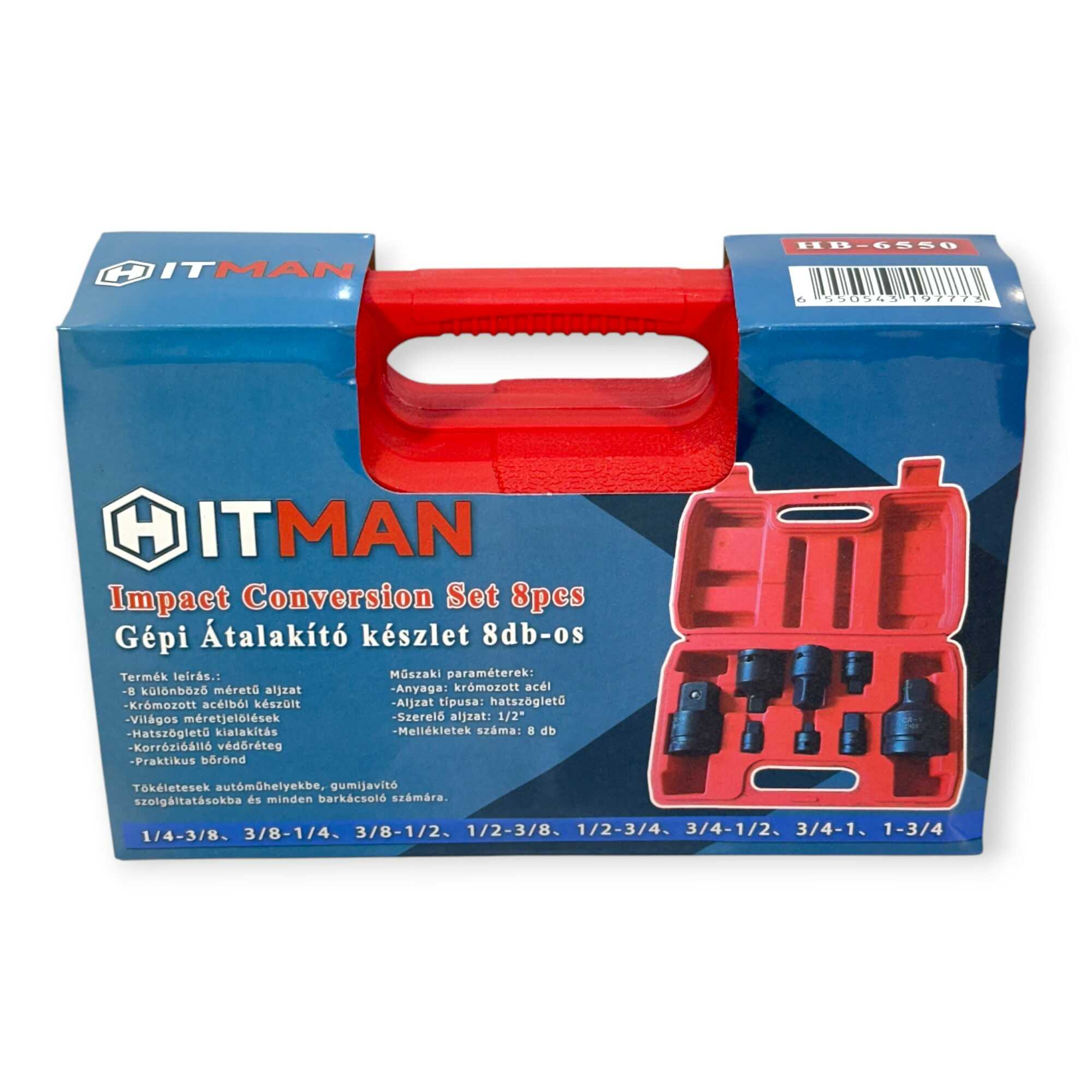 Sosem akadály többé a nem megfelelő méretű befogás. A Hitman HA-6550 egy professzionális, 8 darabos adapter készlet, amely áthidalja a szakadékot a legkülönbözőbb szerszámgépek és dugókulcsok között. Legyen szó 1/4″-os csavarbehajtóról vagy akár brutális erejű 1″-os ipari ütvecsavarozóról, ez a szett minden irányba (lefelé és felfelé is) biztosítja a kompatibilitást. A különleges fekete bevonattal ellátott, krómozott, korrózióálló acél konstrukció garantálja, hogy a szerszámok ne torzuljanak el még nagy nyomatékú pneumatikus használat mellett sem.