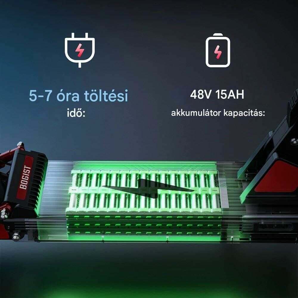- Nagy kapacitású 48V/15Ah lítium akkumulátor: Optimalizálva a hosszú üzemidőre, akár 35-45 km-es hatótávolságot is lehetővé tesz egyetlen töltéssel, ezáltal ideális hosszabb távú utazásokhoz is.
