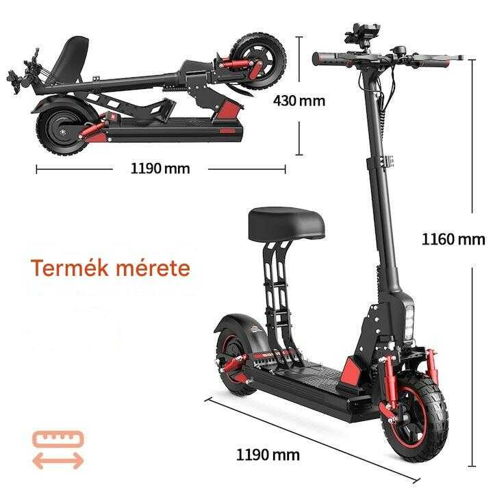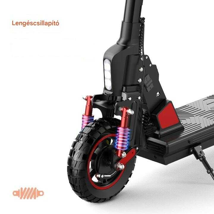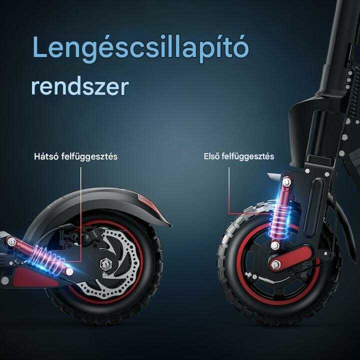 - 10 hüvelykes pneumatikus abroncsok és dupla lengéscsillapítás: Az első és hátsó keréknél található kettős ütésgátló rendszer a nagy, felfújható (pneumatikus) kerekekkel kombinálva simább és kényelmesebb utazást biztosít különböző útfelületeken, így csökkenti a rázkódást és növeli a komfortérzetet.