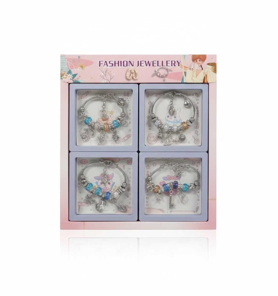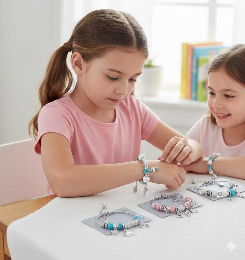 Engedd, hogy elvarázsoljon ez az elegáns és játékos ékszerszett, amely minden kislány csuklóján ragyogó dísz lesz! A karkötők a népszerű függős stílust követik, ahol a színes gyöngyök és a különleges fém charmok (függők) harmonikus egységet alkotnak.