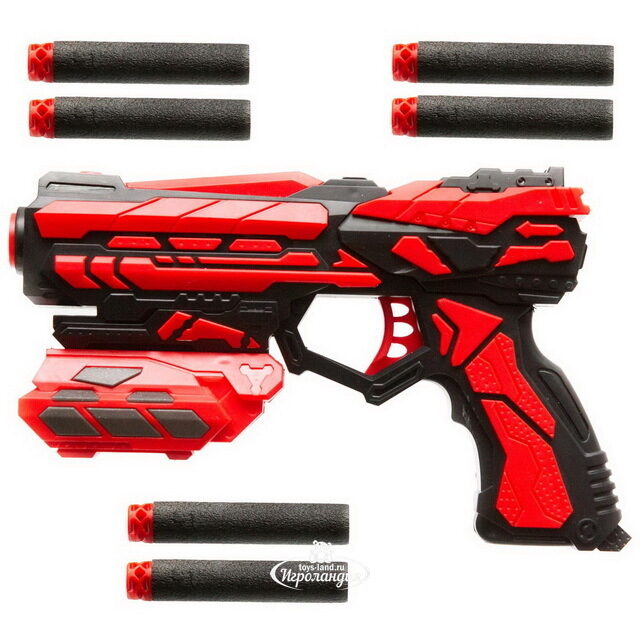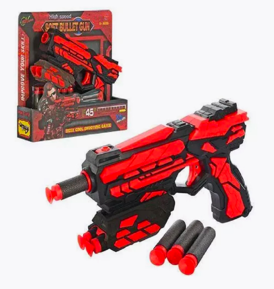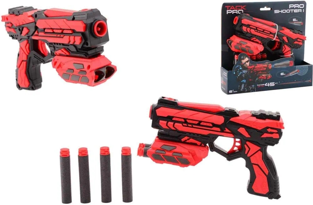 Ez a modern megjelenésű, élénk piros és fekete színekben pompázó játékpisztoly a jövő csatáit hozza el a gyerekszobába. A futurisztikus design és a nagy teljesítmény garantálja az izgalmas játékélményt, legyen szó baráti párbajról vagy precíziós céllövészetről.