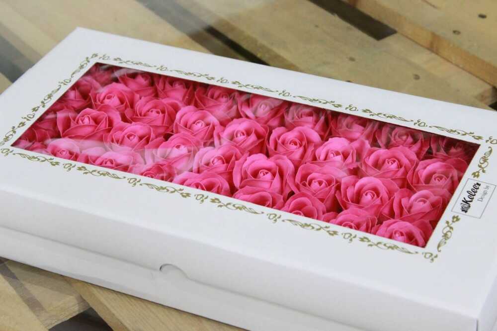 Könnyű felhasználhatóság: A rózsafejek szár nélkül érkeznek, így közvetlenül ragaszthatók díszdobozokba (flower box), koszorúkra vagy egyéb alapokra.