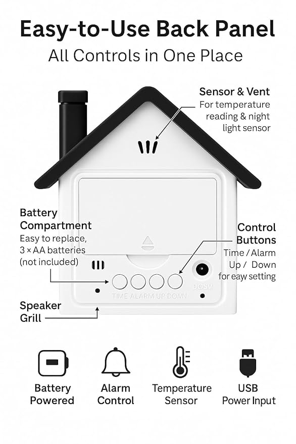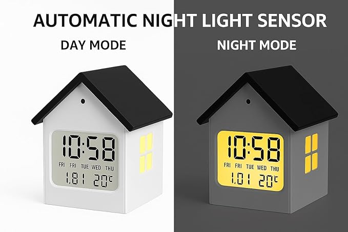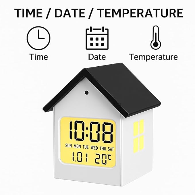 A Domum egy multifunkciós digitális állomás, amely a precíz időmérés mellett a beltéri komfortérzet alapvető paramétereit is figyeli. A házikó formájú kialakítás a biztonságot és az otthon melegét szimbolizálja, míg a letisztult fehér váz és a kontrasztos tető modern esztétikát kölcsönöz a készüléknek.