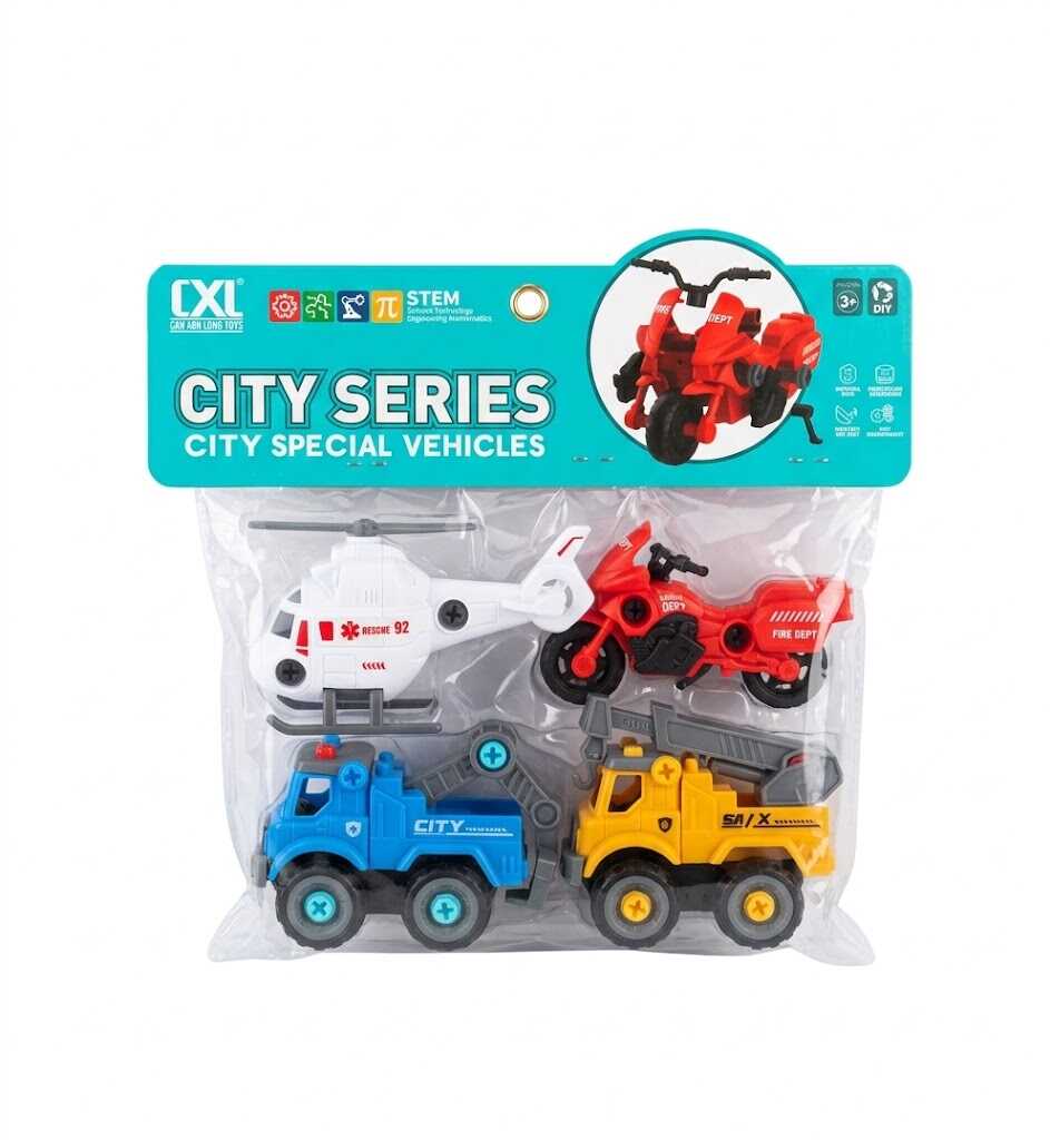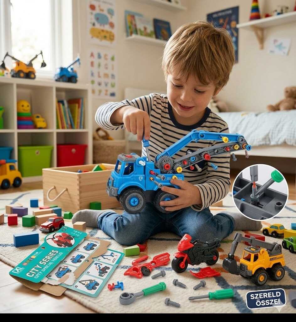 Ez a kreatív készlet a kis mérnökök és ezermesterek számára készült, akik nemcsak játszani szeretnének a járművekkel, hanem meg akarják érteni azok felépítését is. A szett négy különböző városi járművet tartalmaz, amelyeket a mellékelt eszközökkel a gyerekek saját maguk szerelhetnek össze és szedhetnek szét.