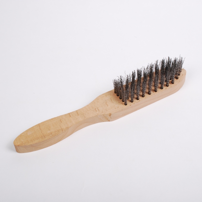 Rozsdamentes acél kefe rozsda és egyéb felületi szennyeződések hatásos eltávolításához, felület előkészítéshez forrasztási vagy hegesztési célra. Kézreálló fa markolat.