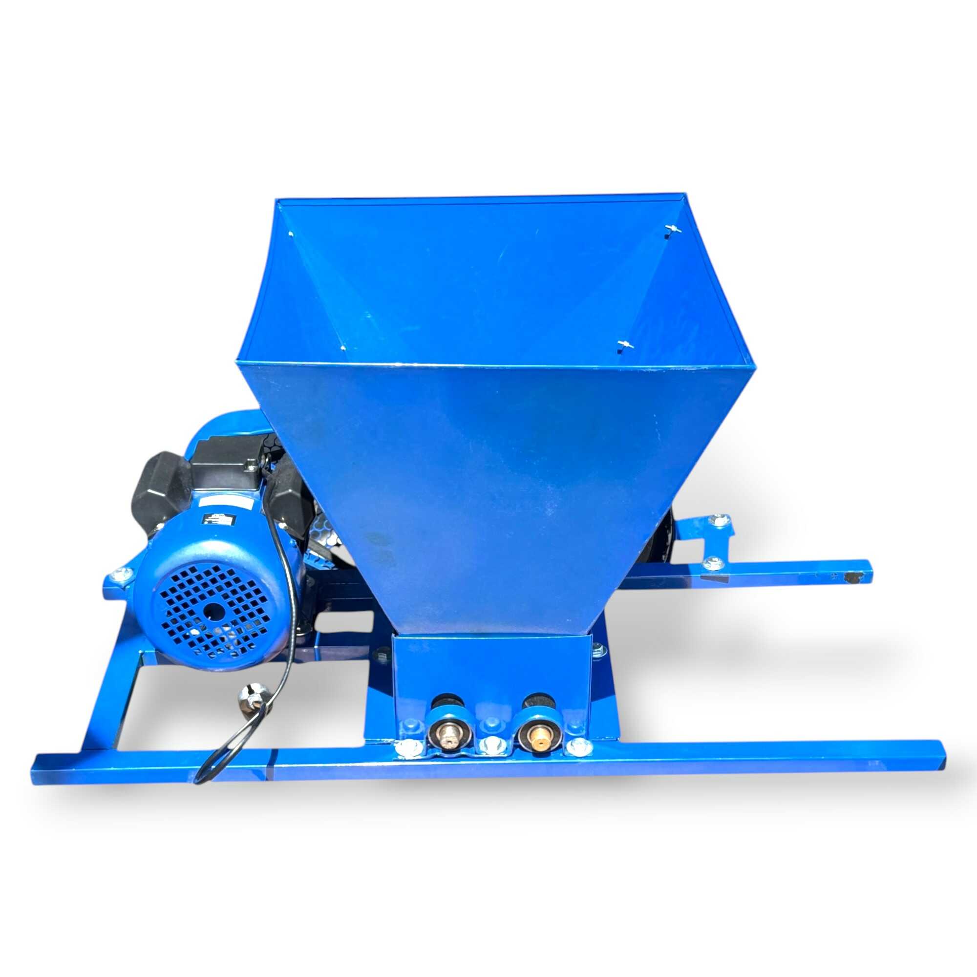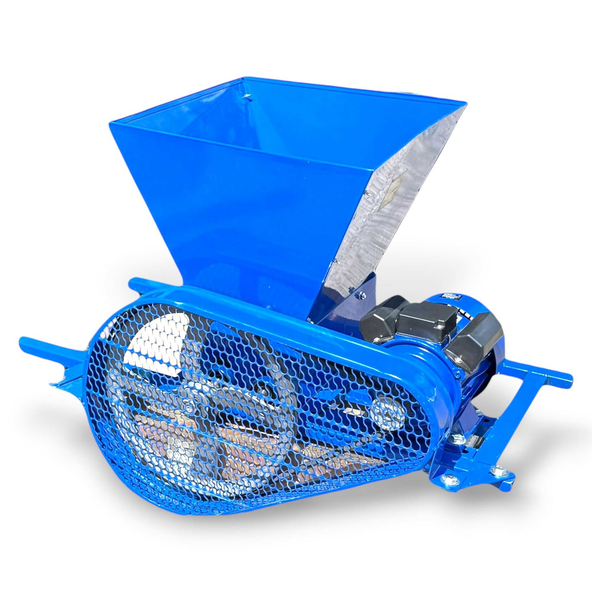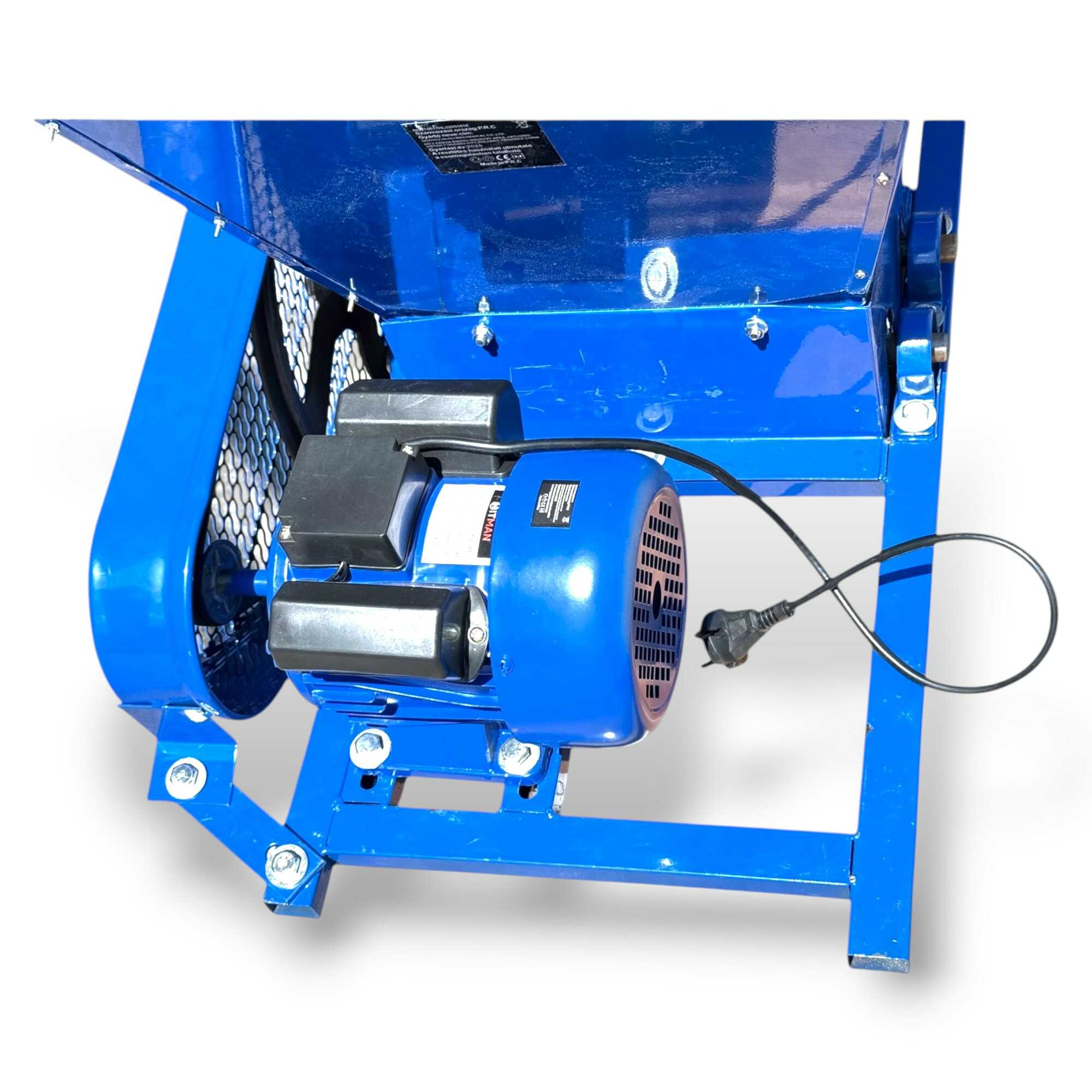 Ez a nagy teljesítményű, 2200 wattos elektromos daráló professzionális megoldást nyújt szőlő, alma, körte és egyéb bogyós gyümölcsök hatékony háztáji feldolgozásához. A berendezés lelke egy strapabíró elektromos motor, amely ékszíjas (hevederhajtásos) áttétellel mozgatja a darálómechanizmust, ami mechanikai védelmet és stabil erőátvitelt biztosít a sűrűbb alapanyagok esetén is. A nagyméretű garat rozsdamentes acélból készült, így ellenáll a gyümölcssavak maró hatásának és garantálja a higiénikus élelmiszer-feldolgozást. A masszív, acéllemezből hegesztett vázszerkezet és a csúszásmentes lábak maximális stabilitást nyújtanak üzem közben, míg a fémhálós védőrács gondoskodik a kezelő biztonságáról. Az eszköz nagy töltőkapacitása révén jelentősen felgyorsítja a mustkészítés és a gyümölcscefre előállításának folyamatát, minimalizálva a fizikai erőkifejtést. Ideális választás borászok és kerttulajdonosok számára, akik tartós, könnyen tisztítható és megbízható gépet keresnek a szezonális betakarítási munkákhoz.
