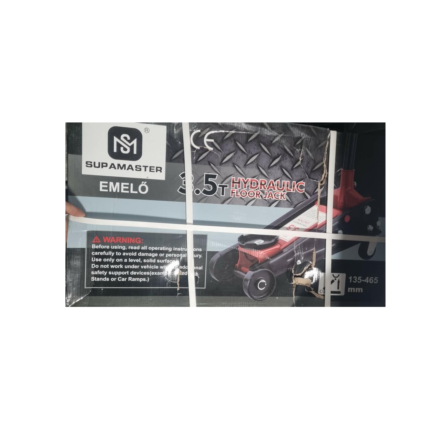 A doboz tartalmazza a SUPAMASTER 3.5T hidraulikus krokodil emelőt, a stabil emelőrudat és a biztonságos használathoz szükséges útmutatót.