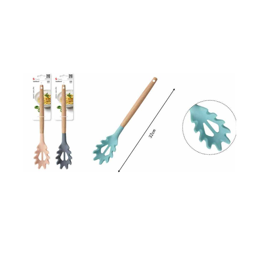 Tegye professzionálissá a tésztafélék tálalását ezzel a speciálisan kialakított, szilikon fejű kiszedő kanállal. A fogazott szélű, belső nyílással ellátott fej tökéletes megoldást nyújt a spagetti, tagliatelle vagy egyéb hosszú tészták biztonságos kiemeléséhez és adagolásához, miközben a felesleges főzővíz azonnal lecsöpög. A természetes fa nyél és a modern szilikon kombinációja stílusos és tartós kiegészítője minden konyhának.