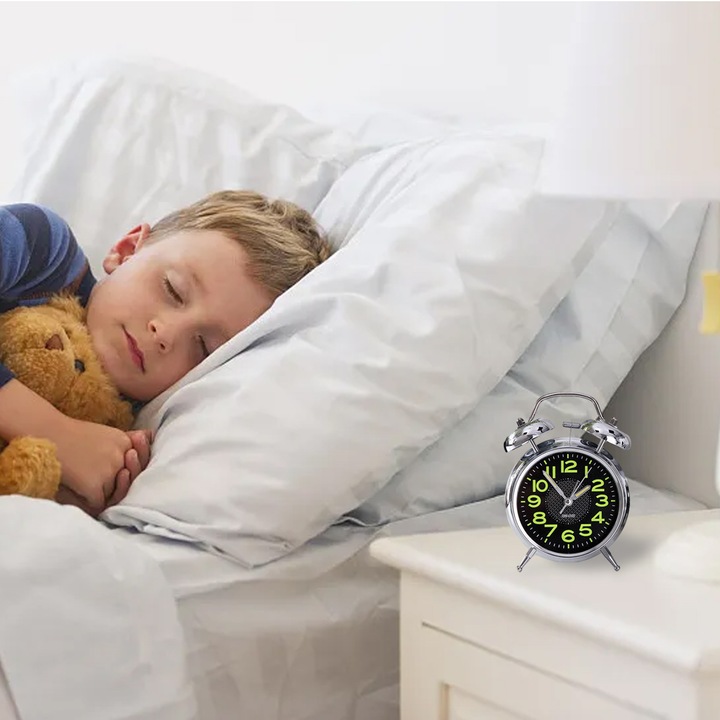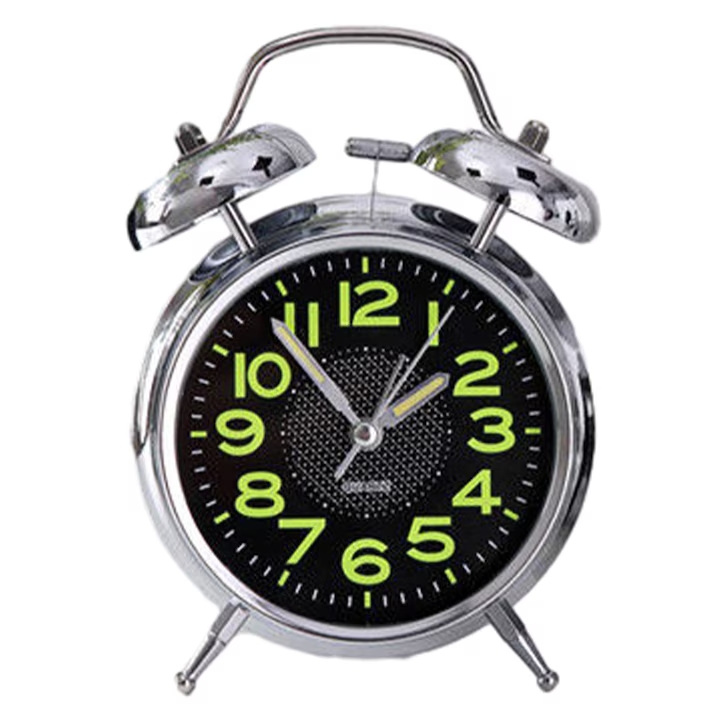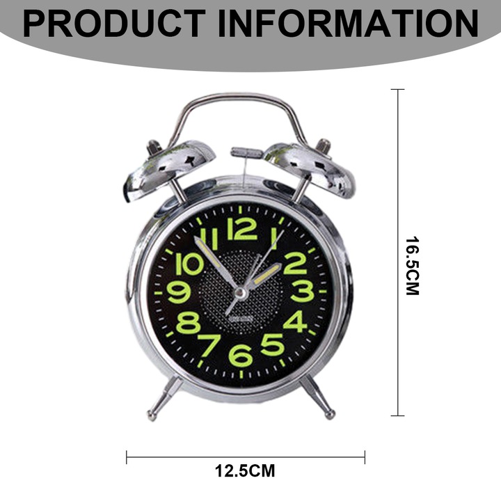 Ez a prémium króm felületű fém ébresztőóra a klasszikus eleganciát ötvözi a modern funkcionalitással A sötét számlapon található fluoreszkáló számjegyek és mutatók gyenge fényviszonyok között is könnyű leolvashatóságot biztosítanak A speciális halk járású szerkezet garantálja a csendes környezetet a pihenéshez míg a mechanikus dupla harang megbízhatóan ébreszt minden reggel