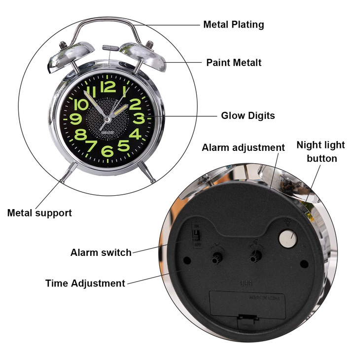 – Dizájn: Csillogó króm fém ház valódi fém harangokkal és masszív lábakkal