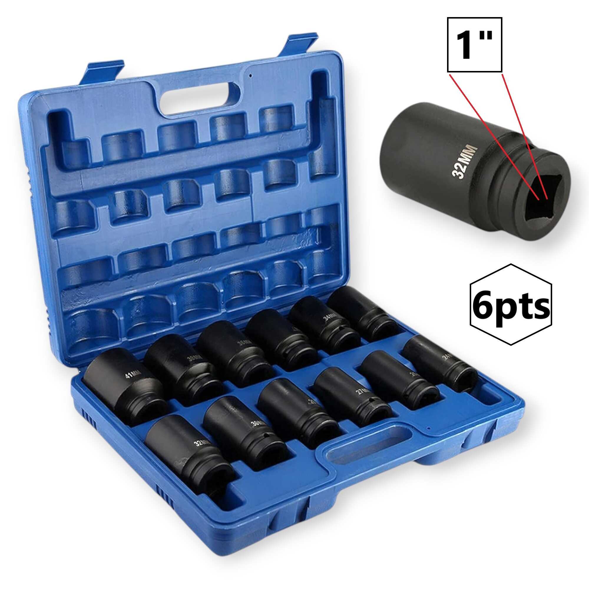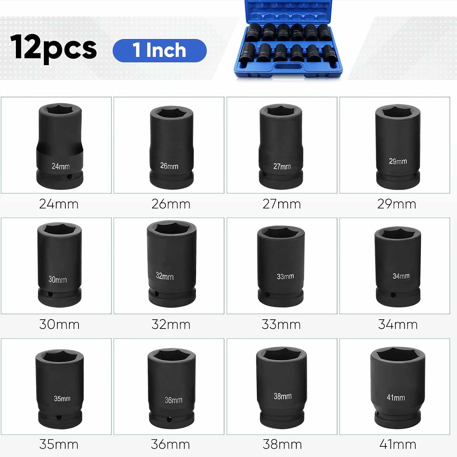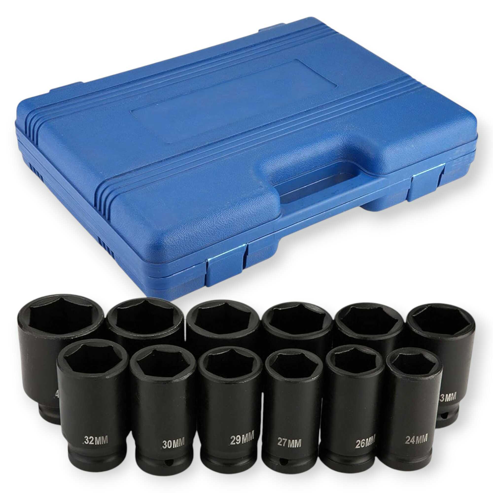 * 12 db 6-PTS (6-csillagos) mélyített gépi dugókulcs (24, 26, 27, 29, 30, 32, 33, 34, 35, 36, 38, 41 mm)