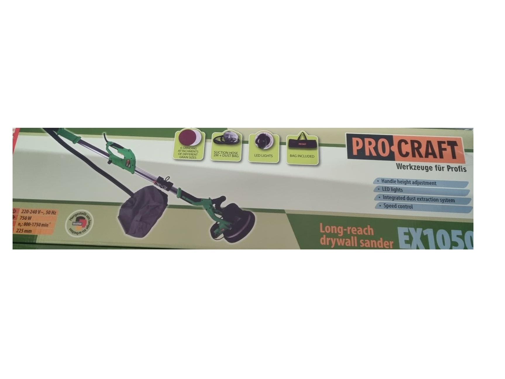 A szett tartalmazza a PROCRAFT EX1050 csiszológépet, 6 darab különböző szemcsézettségű csiszolópapírt, egy 2 méteres gégecsövet porzsákkal, a hordtáskát és a beépített LED világítási rendszert.