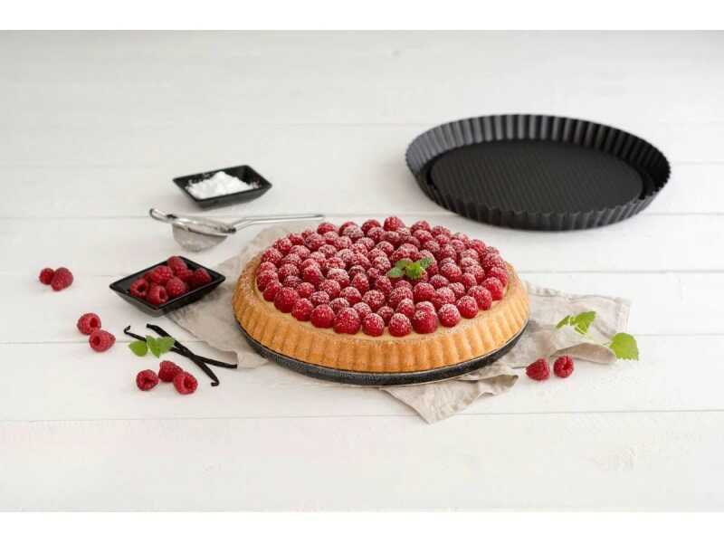 Ez a forma ideális választás omlós tésztájú piték, quiche-ek vagy gyümölcstorták készítéséhez. A belső felületén található dekoratív mintázat és a tapadásmentes bevonat együttesen biztosítja, hogy a sütemények könnyedén kijöjjenek a formából, megőrizve esztétikus alakjukat. Az alacsony falú kialakítás segíti az egyenletes átsülést és a tészta ropogósságának megőrzését.