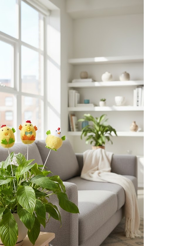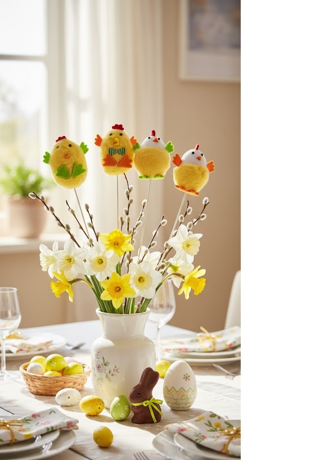 Ezek a kompakt méretű dekorációk hosszú pálcikára vannak rögzítve, így rendkívül egyszerűen elhelyezhetők virágcserepekben, ünnepi asztaldíszekben vagy tavaszi csokrokban. A különböző stílusú kiegészítőkkel díszített csibék lehetővé teszik, hogy változatos és játékos kompozíciókat hozzon létre.