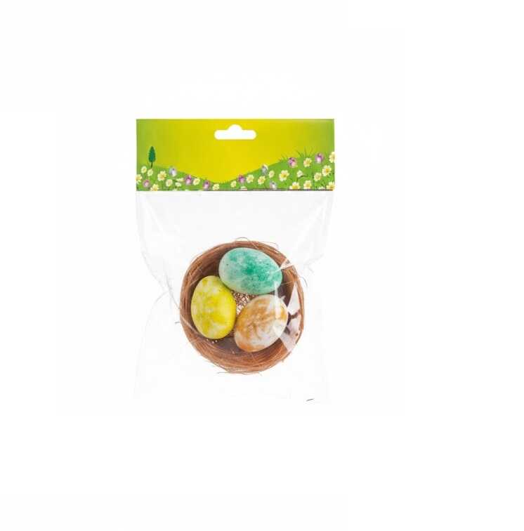 * Kialakítás: Fonott rost fészek, benne 3 darab márványos mintájú tojással
