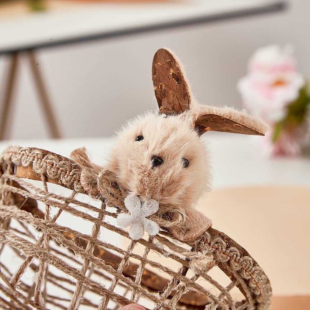 Csempésszen rusztikus bájt az ünnepi dekorációba ezzel a természetes hatású nyuszis kosárral. A masnival díszített, selymes tapintású nyuszi, amint kíváncsian kukucskál ki a csipkével szegélyezett fonott kosarából, a vidéki húsvétok meghitt és békés hangulatát hozza el az Ön otthonába.