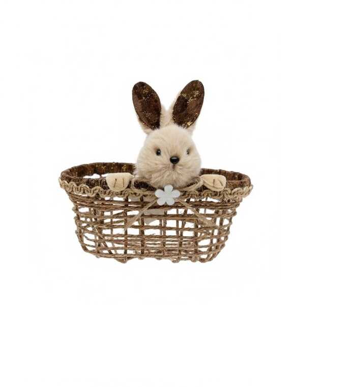 * Kialakítás: Flokkolt (pelyhesített) nyuszi figura, csipkével és virággal díszített fonott hatású kosárban