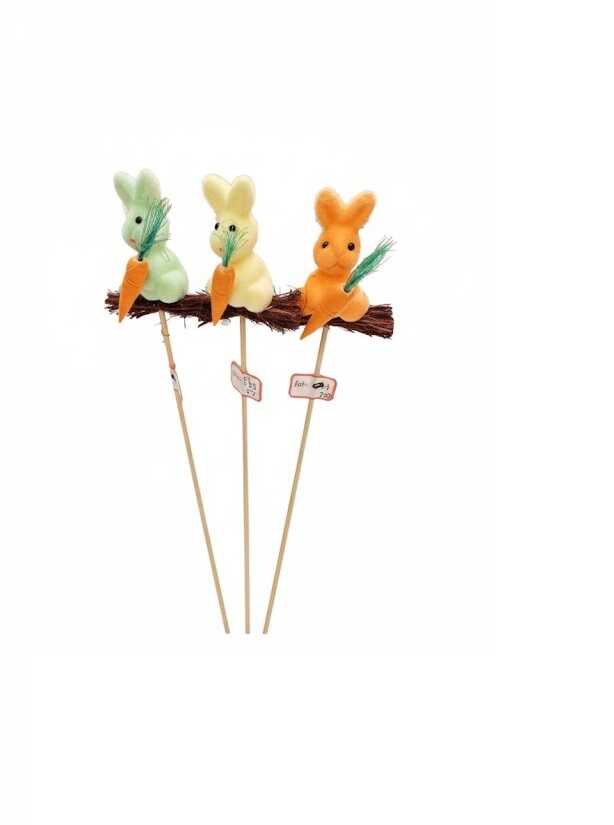 * Kialakítás: Flokkolt (pelyhesített) nyuszi figurák faág alapon, sárgarépa kiegészítővel és beszúró pálcával