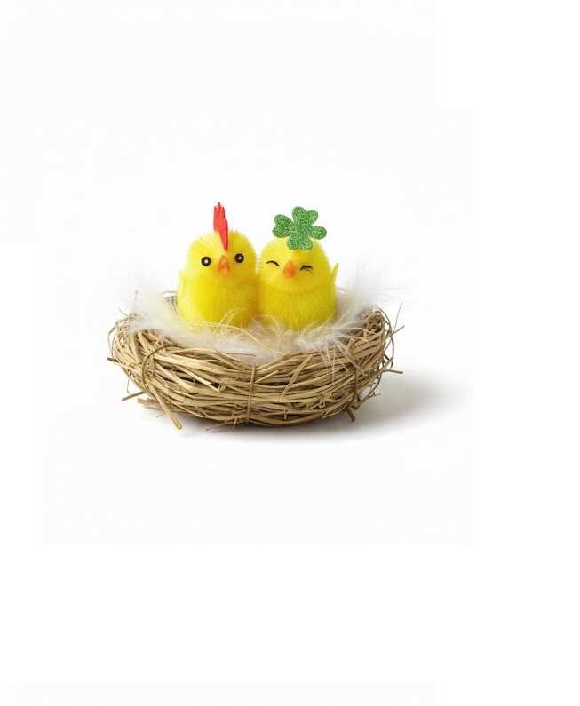 Vigye el a tavaszi ébredés legkedvesebb pillanatait otthonába ezzel a bájos, fészekben pihenő csibe párossal. Az élénksárga, selymes tapintású kiscsubék és az apró virágdíszek látványa az ünnepi készülődés és a gondoskodás szeretetét költözteti minden helyiségbe.