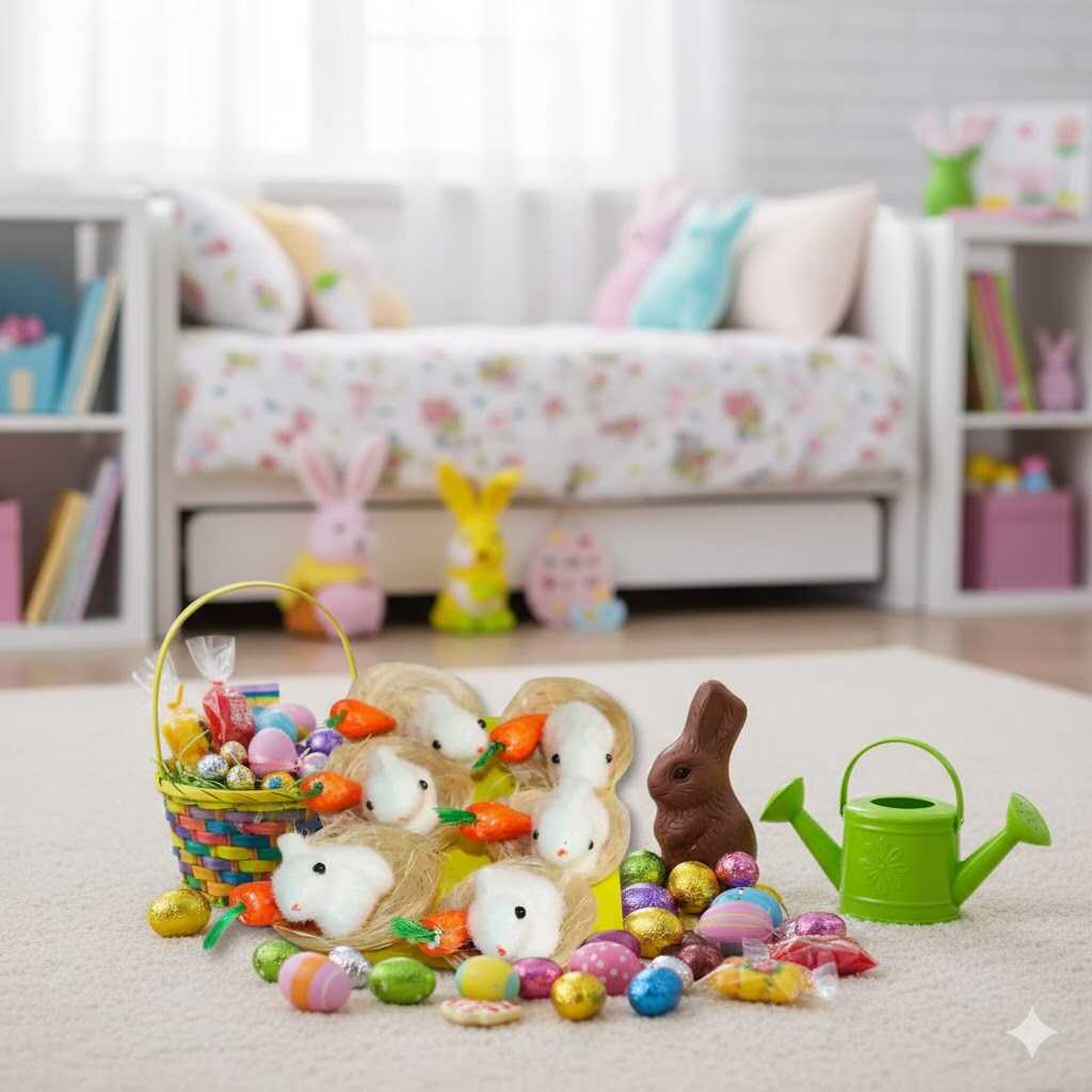 * Kialakítás: Flokkolt (pelyhesített) nyuszi figurák, fonott hatású fészekben, filc sárgarépa és műfű díszítéssel