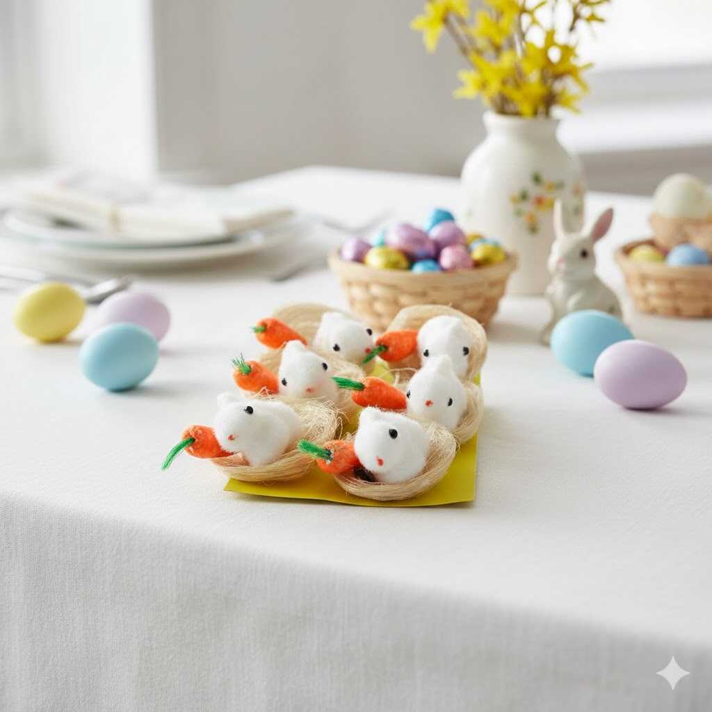 Varázsoljon elragadó tavaszi életképet otthonába ezzel a részletgazdag húsvéti dekorációs készlettel. A hófehér, selymes tapintású nyuszik, amint gondosan őrzik lédús sárgarépájukat a természetes hatású fészkükben, az ünnepi gondoskodás és a kerti vidámság legszebb pillanatait idézik meg.