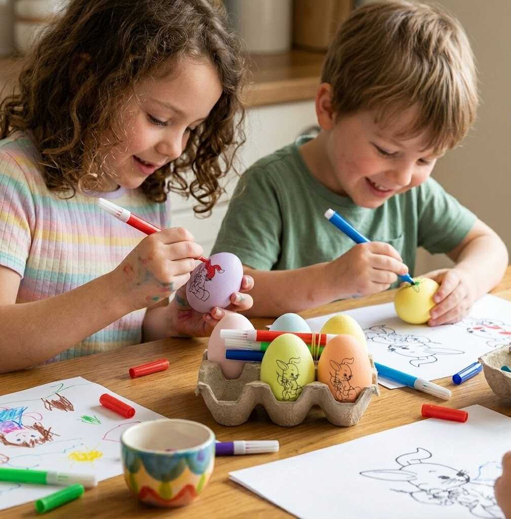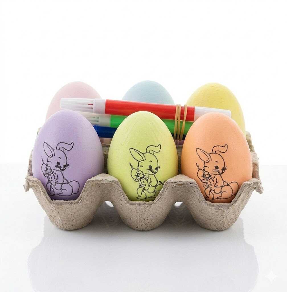 A készletben pasztell színekben pompázó tojásokat talál, amelyeken kedves húsvéti grafikák (például nyuszik és virágok) várják, hogy a mellékelt filctollakkal életre keltsék őket. A praktikus tojástartó nemcsak a tárolást segíti, hanem az alkotás közben is stabilan tartja a díszeket.