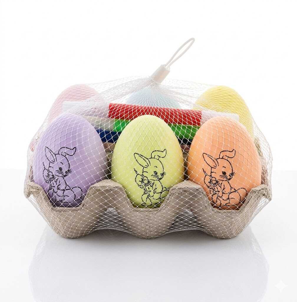 A csomag tartalma: 6 darab színes, mintás tojás, egy praktikus tojástartó és színes filctollak a dekoráláshoz.