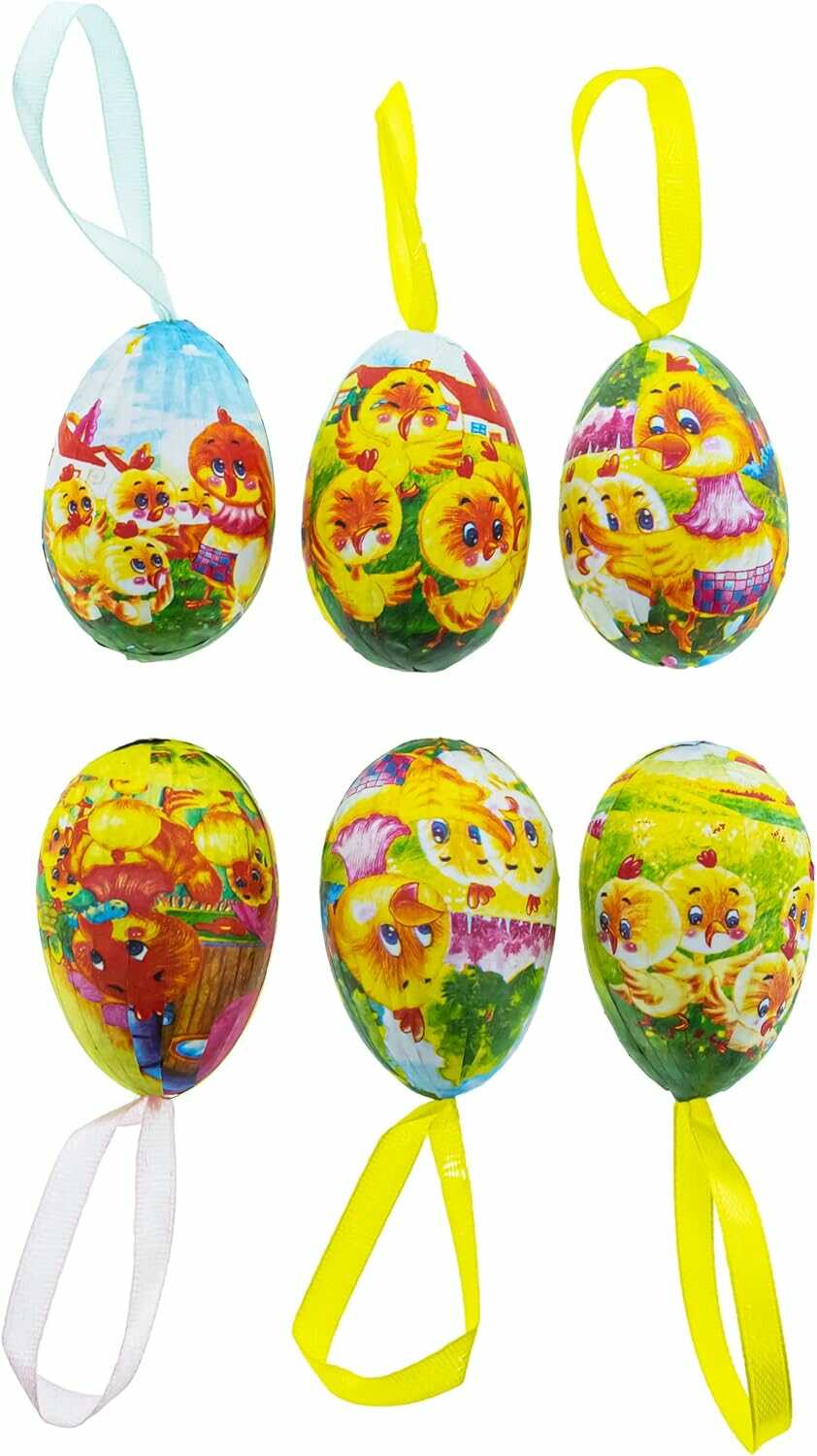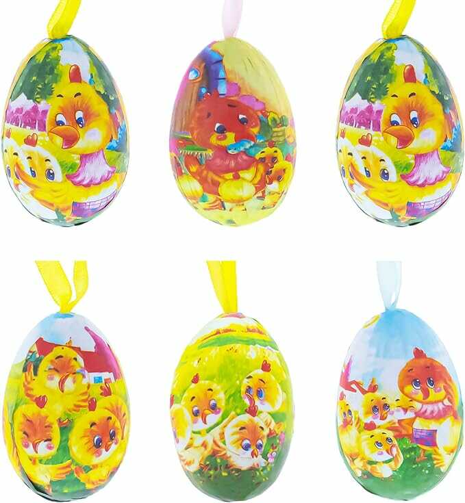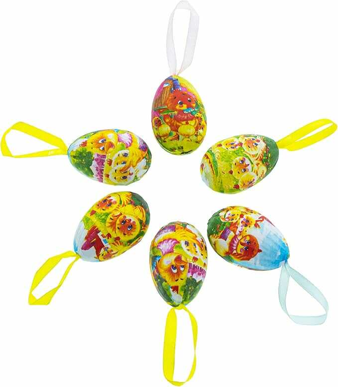 Ezek az 5×7 cm-es tojások praktikus selyemszalag akasztóval rendelkeznek, így kiválóan alkalmasak barkaágak, húsvéti fák vagy ablakpárkányok díszítésére. A szettben található hat különböző alapszínű (lila, kék, zöld, sárga, narancs és pink) tojást egyedi, matricázott hatású ünnepi grafikák teszik különlegessé, amelyek remekül kiegészítik a klasszikus tavaszi dekorációkat.