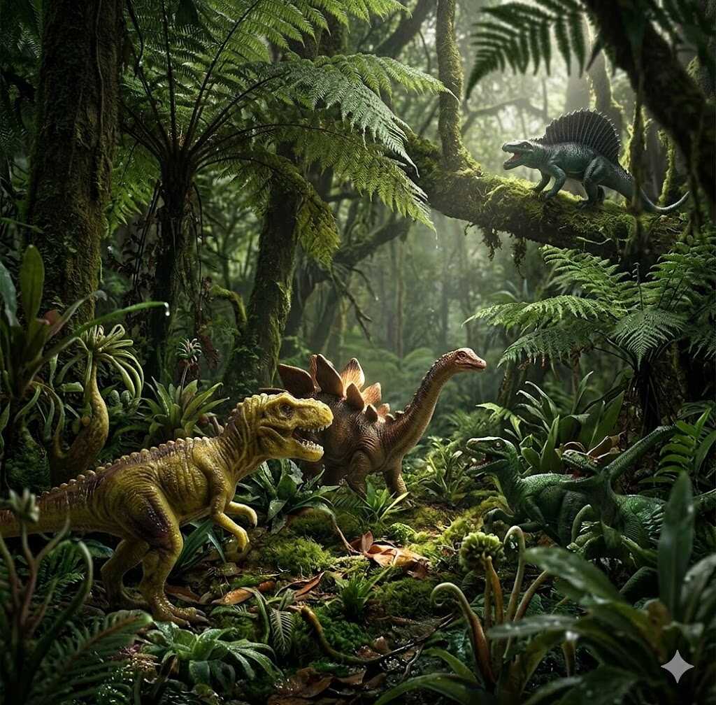 A csomagban található figurák az ősvilág sokszínűségét mutatják be: a félelmetes, hatalmas állkapcsú Tyrannosaurus Rextől kezdve a hátán jellegzetes vitorlát viselő Spinosaurusig minden fontos faj helyet kapott. A növényevők kedvelői is megtalálják kedvenceiket, például a különleges fejdíszéről felismerhető Parasaurolophust. A figurák élethű, pikkelyes textúrával és természetes színekkel (zöld, barna, sárga árnyalatok) rendelkeznek, amelyek még hitelesebbé teszik a játékélményt.