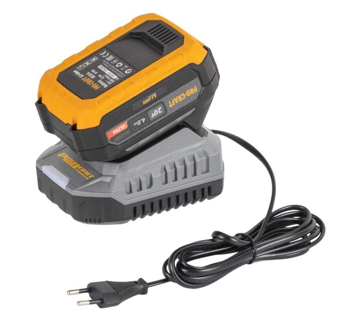 A szett tartalmazza a PROCRAFT INDUSTRIAL PA20BL géptestet, 1 db 20V 4Ah-s akkumulátort, a gyorstöltőt és a használati útmutatót.