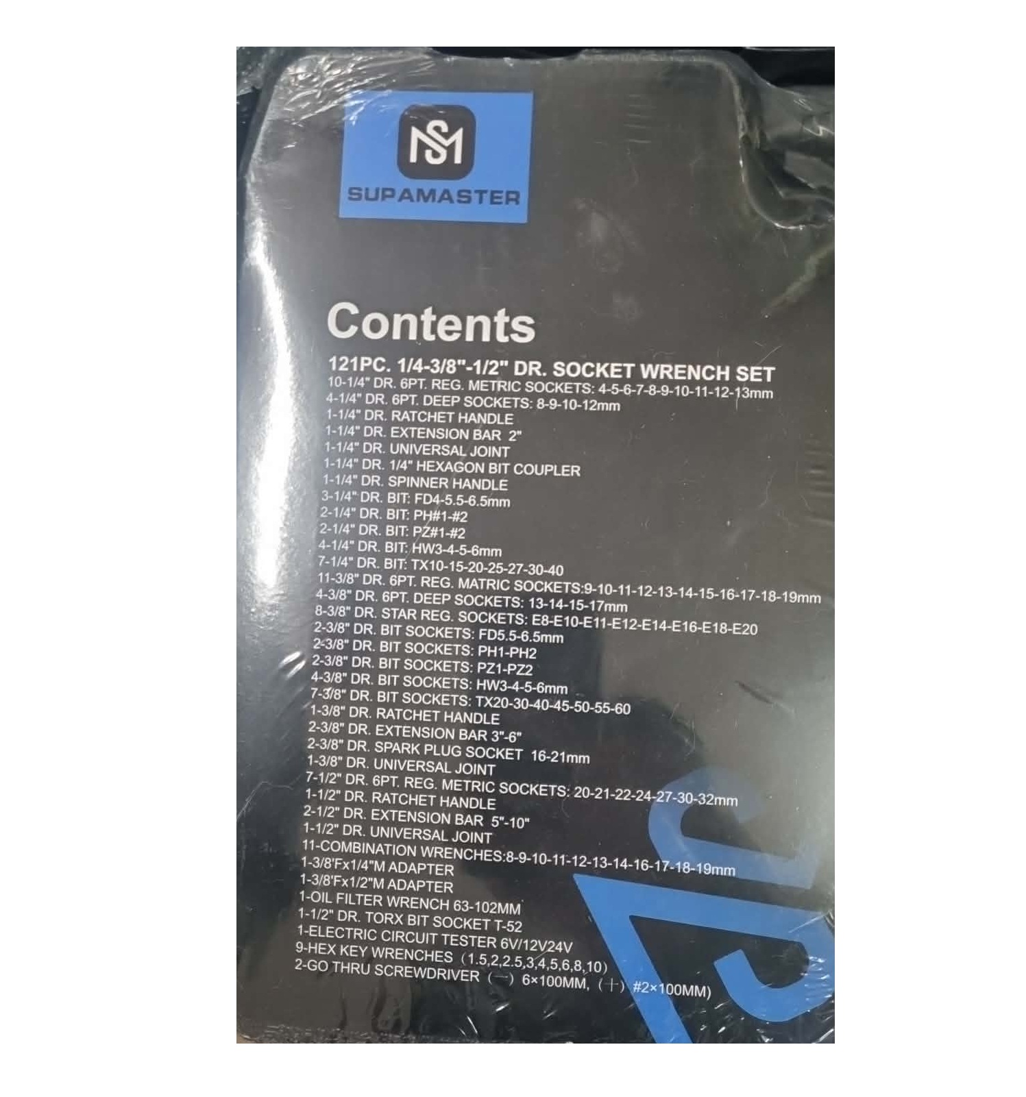 A készlet tartalmazza a 121 darabos Supamaster szerszámkészletet minden adapterrel, univerzális csuklókkal és hosszabbítókkal együtt, egy professzionális, rendszerezett hordtáskában.
