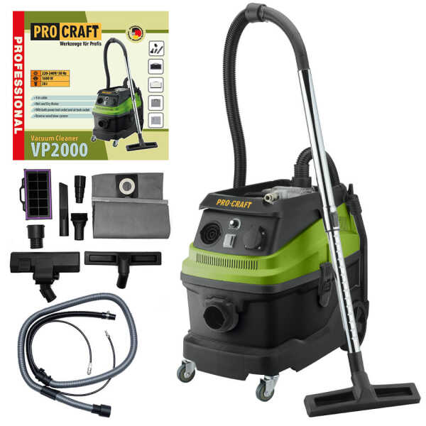 PROCRAFT VP2000 porszívó, 4 db kerék, 2 db kefe, különböző szívófejek (fúvókák), 4 m-es tömlő, vízcsatlakozó tömlő, porzsák és szűrő.
