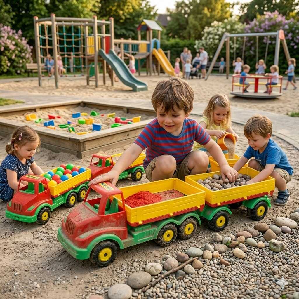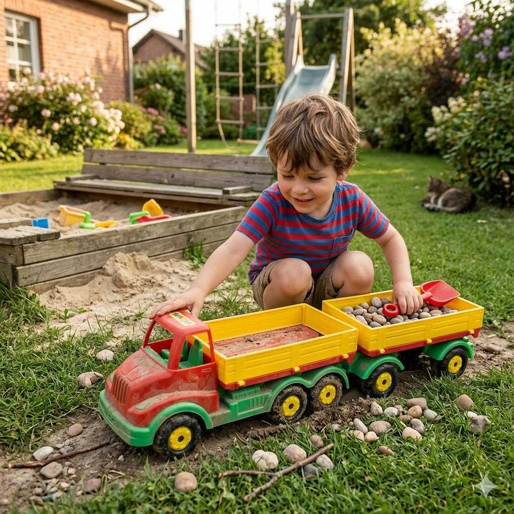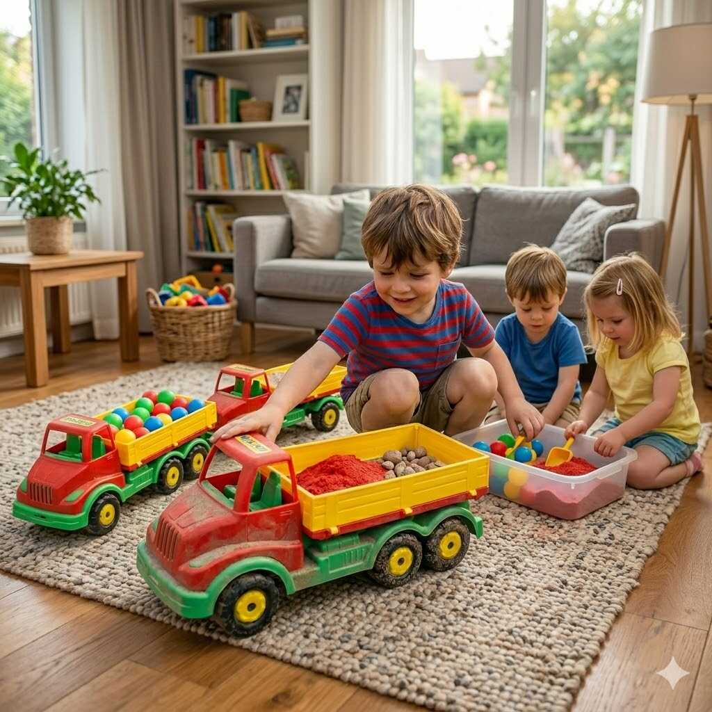 Fejlesztő játék: A teherautó és az utánfutó összekapcsolása, valamint a rakomány elhelyezése fejleszti a finommotoros készségeket és a logikai gondolkodást.