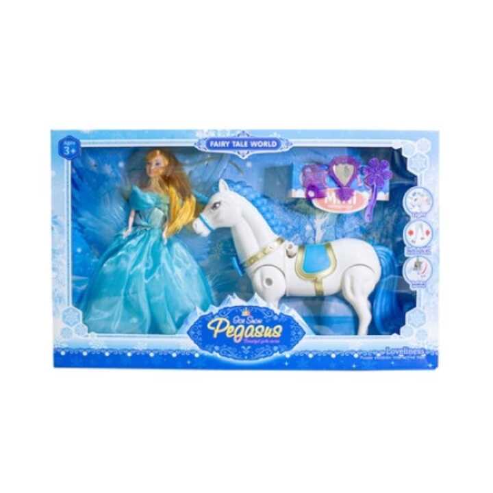A készlet egy gyönyörű, szőke hercegnőt és hűséges társát, egy csillogó szárnyas unikornist tartalmazza. Ez a különleges paripa nem csupán egy figura: mozgatható lábainak köszönhetően képes a járásra, így olyan hatást kelt, mintha valódi lenne. A játékélményt tovább fokozzák a látványos fény- és hangeffektek, amelyek életre keltik a mesét.