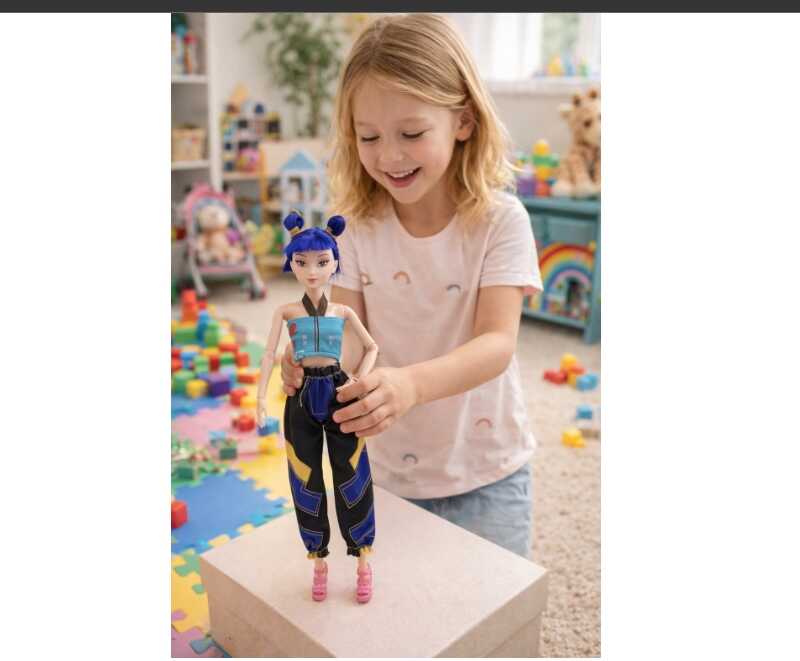 Részletgazdag textil ruházat: A baba minőségi, mintás felsőt és stílusos nadrágot visel, amely hűen tükrözi a Demon Hunters karakterek egyedi világát.