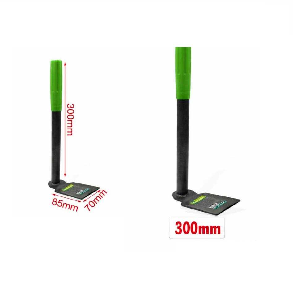 Ez a 300 mm teljes hosszúságú eszköz egy 85 mm széles és 70 mm mély, edzett acél fejjel rendelkezik, amely fekete korróziógátló bevonatot kapott. A szerszám váza strapabíró fémcső, amely a végén egy ergonomikus, élénkzöld műanyag markolatot kapott. A markolat textúrázott felülete biztos fogást nyújt, és megakadályozza a kéz elcsúszását munka közben. A kapa éle gyárilag élezett, így azonnal bevethető a keményebb földfelszín ellen is.