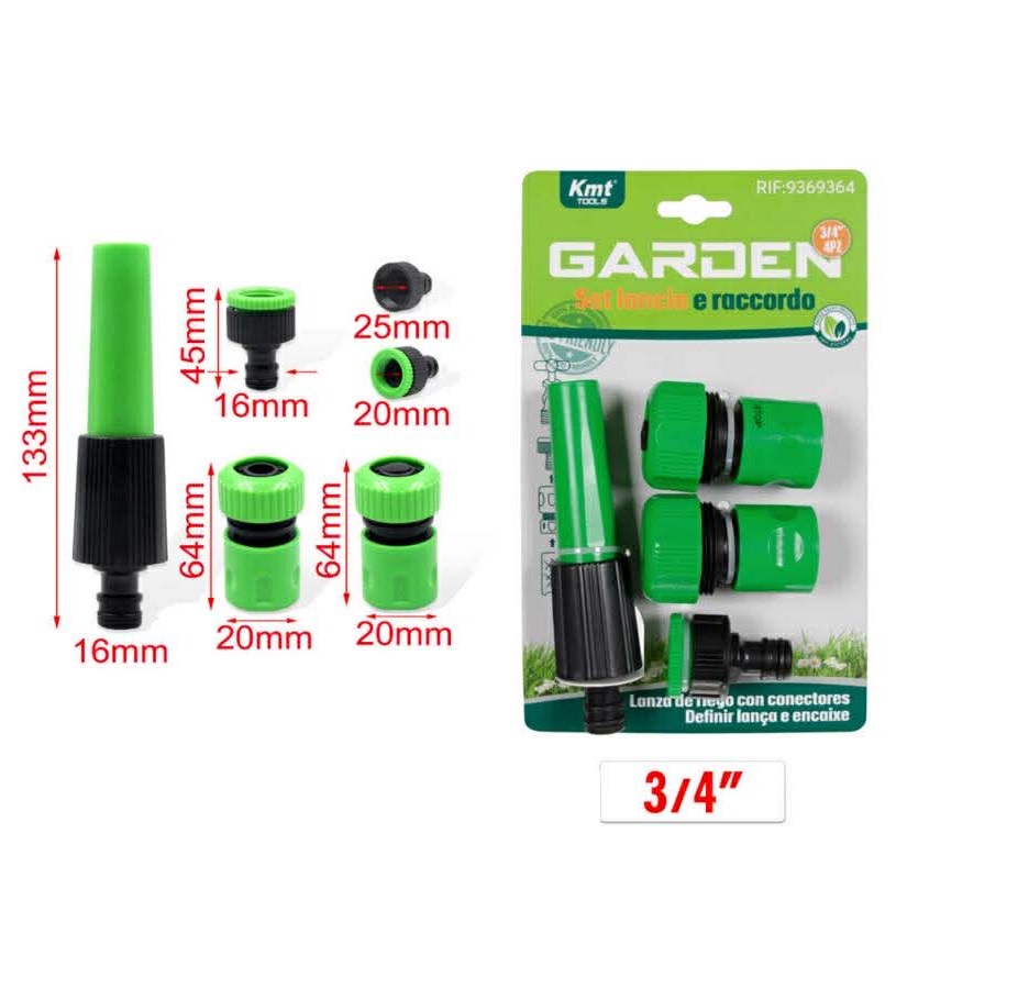 1 darab állítható locsolófej, 1 darab 3/4″-os csapcsatlakozó, 1 darab 3/4″-os gyorscsatlakozó és 1 darab 3/4″-os vízstoppos gyorscsatlakozó kártyás kiszerelésben.