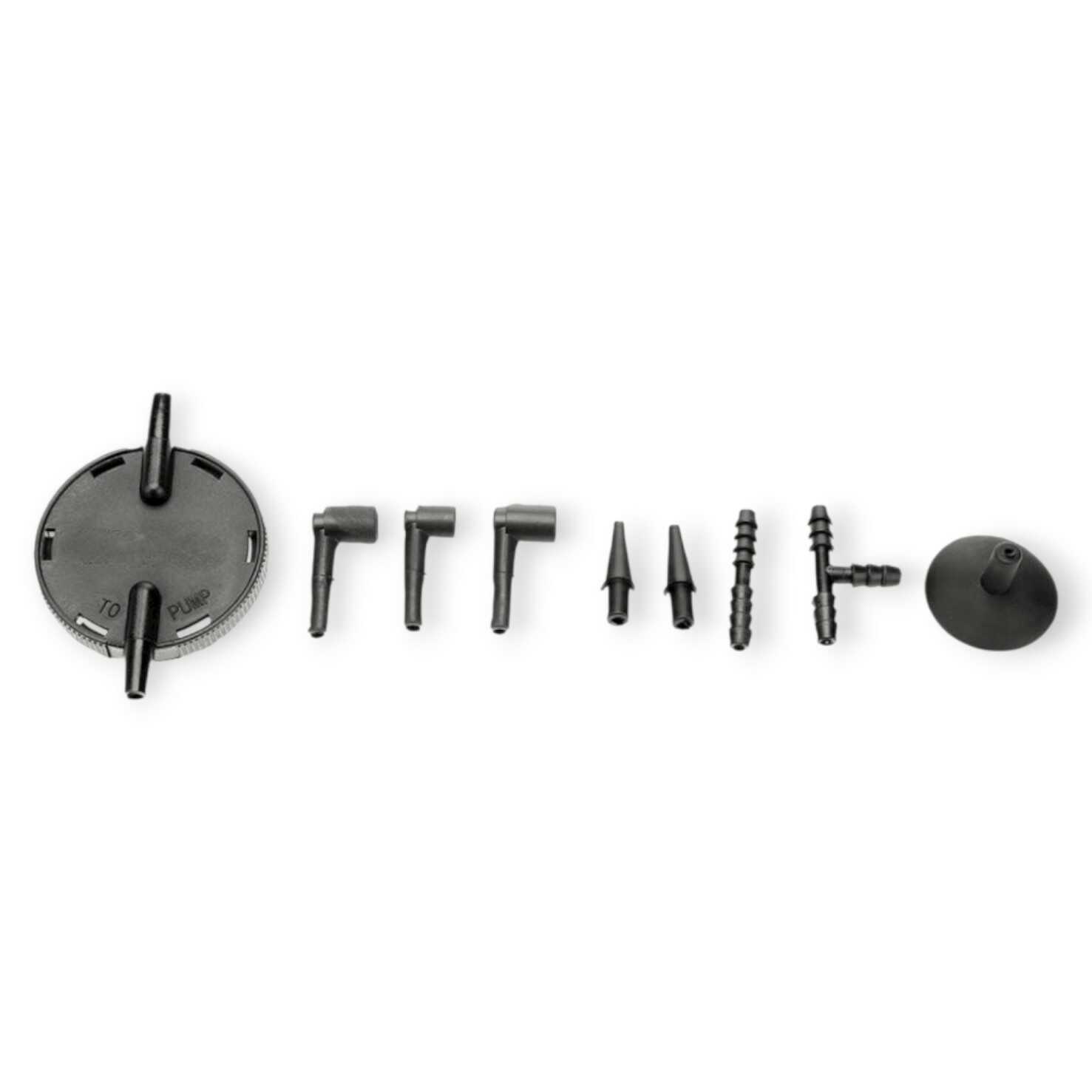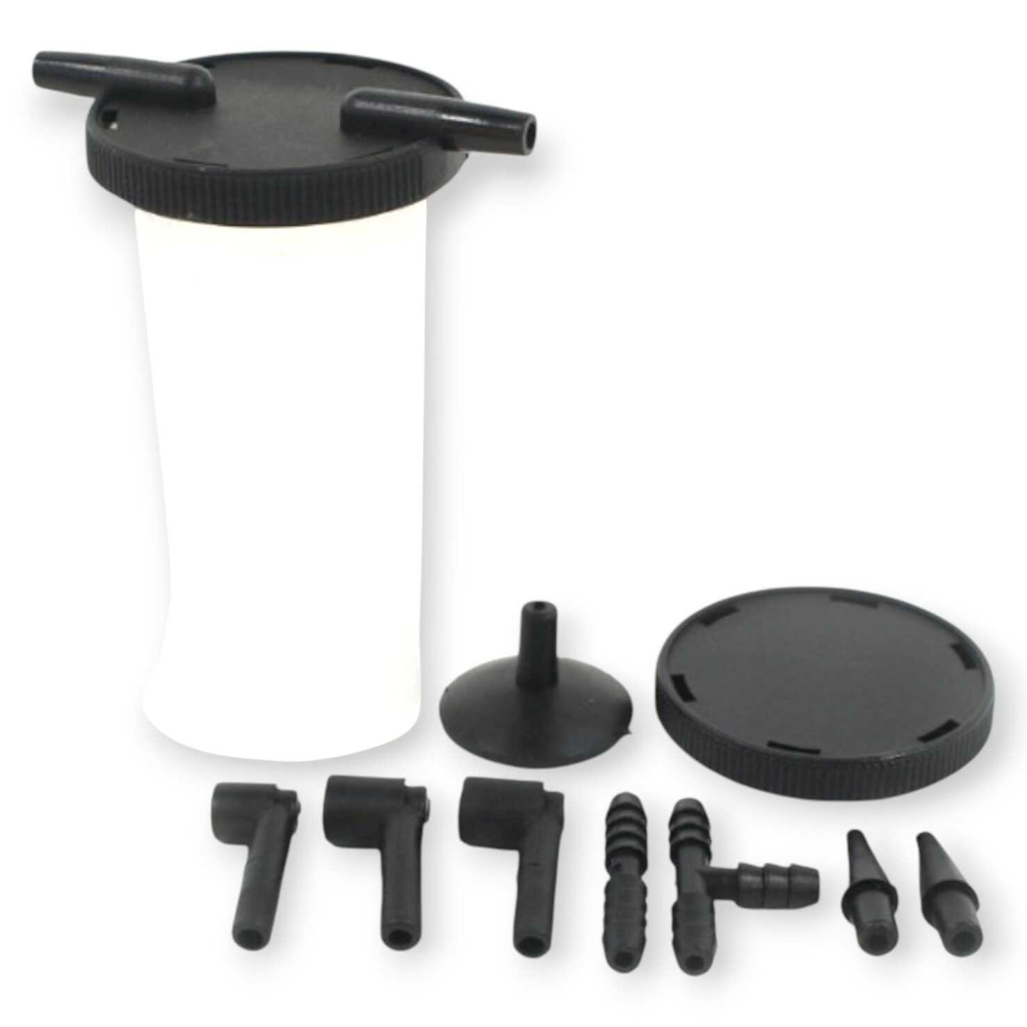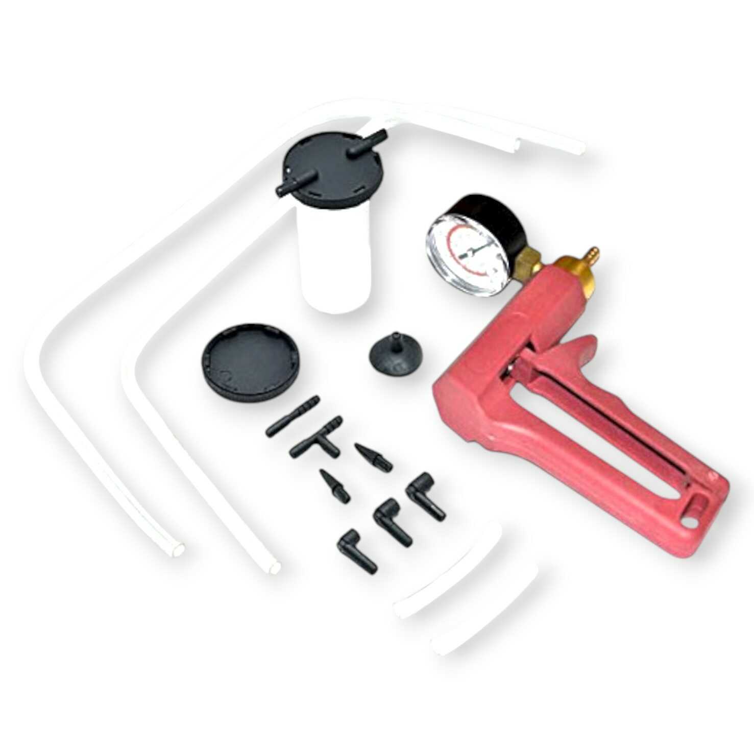 * 1 db kézi vákuumszivattyú mérőórával, flexibilis csövek, tartályok a folyadék felfogásához, különféle adapterek és a hordozható tárolókoffer.