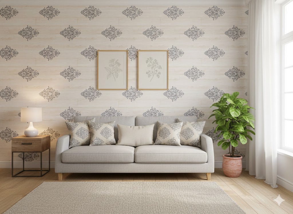 Szeretné a patinás faburkolat és az elegáns minták találkozását látni otthonában anélkül, hogy bonyolult és költséges dekorálásba kezdene? Ez az egyedi, világos fahatású alapon szürke ornamentikus motívumokkal díszített tapéta azonnal kifinomult és tiszta atmoszférát teremt bármely helyiségben. Tökéletes választás a nappali hangsúlyosabbá tételére, de kiválóan alkalmas bútorok frontjának vagy polcok hátfalának stílusos megújítására is, ötvözve a természetes hatást a klasszikus eleganciával.