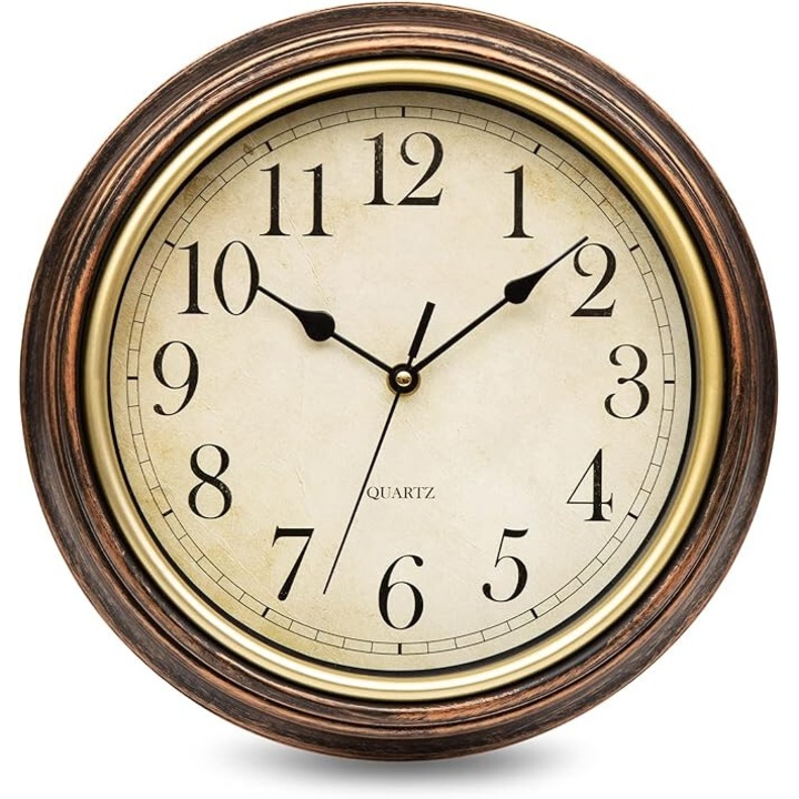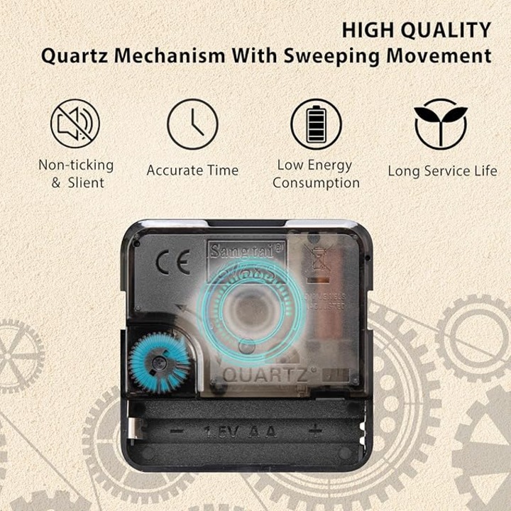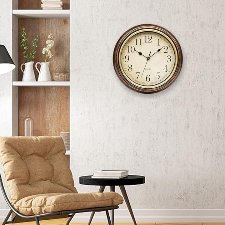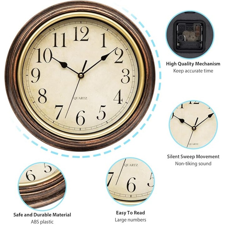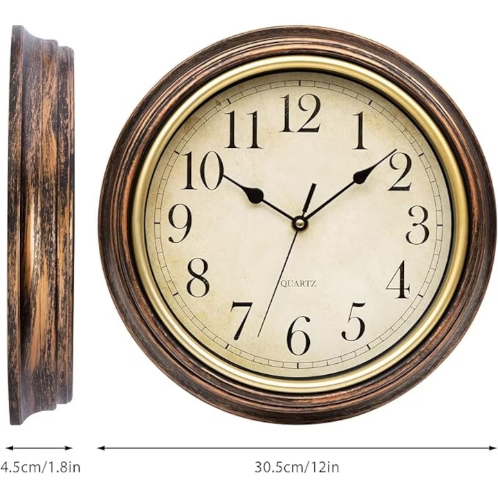 – Dizájn: Klasszikus kerek forma antikolt hatású kerettel és könnyen olvasható arab számokkal díszített számlappal