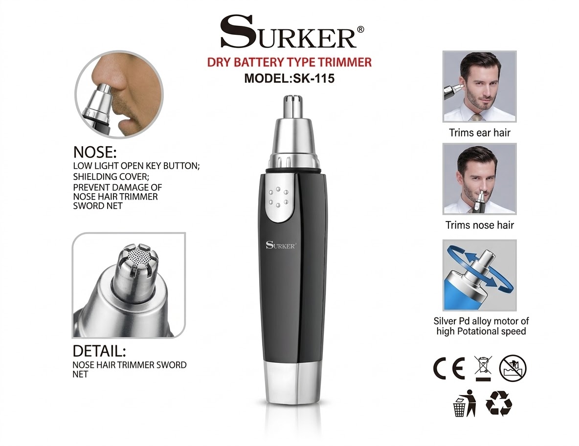 A Surker SK-115 specialistája az orr és a fül nehezen elérhető területeinek. Használata rendkívül egyszerű: a védőkupak eltávolítása után a középső gombbal indítható, a kúpos vágófej pedig minden irányból hatékonyan távolítja el a nemkívánatos szőrszálakat. Ideális választás az utolsó pillanatos igazításokhoz egy fontos tárgyalás vagy randevú előtt. Mivel vezeték nélküli és elemmel működik, Ön bárhol, bármikor (Dry battery type) bevetheti a tökéletes megjelenés érdekében.